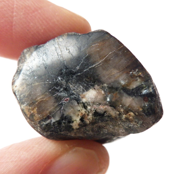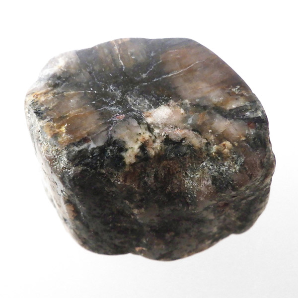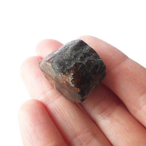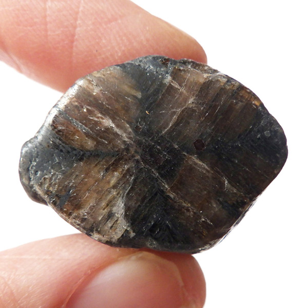 ブラジル産、キャストライト磨き原石です。キャストライトは濃いブラウンに黒の十字模様が大変魅力的な石です。キャストライトの名前は、輪切りにすると黒い十字の模様が現れることから、ギリシャ語で「対角線的な配列」という意味の「Chiastos」に由来しています。キャストライトは、黒鉛(グラファイト)などの黒色含有物を対称的に含んだ紅柱石です。クロスストーンとも呼ばれ、粘板岩と花こう岩の接触部に産出します。黒の十字が目を引く一方、茶色のサイド面の結晶がキラキラと美しく見えるのも魅力的です。