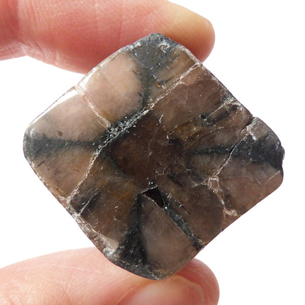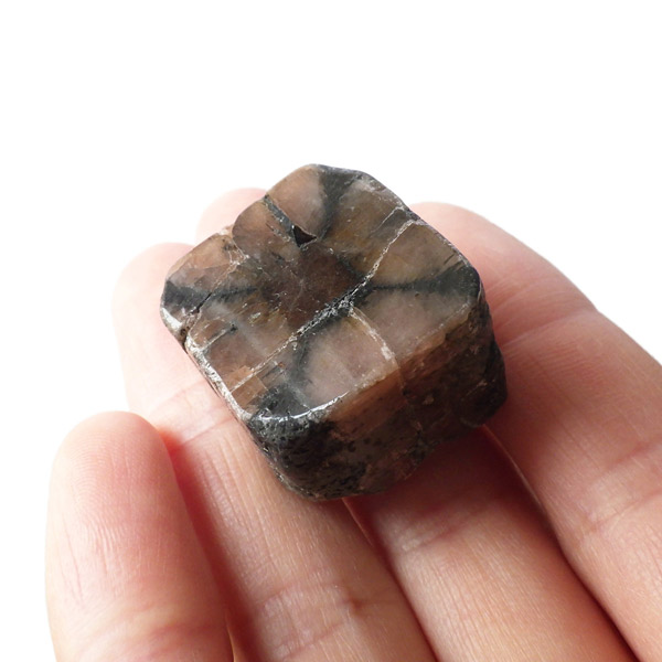 ブラジル産、キャストライト磨き原石です。キャストライトは濃いブラウンに黒の十字模様が大変魅力的な石です。キャストライトの名前は、輪切りにすると黒い十字の模様が現れることから、ギリシャ語で「対角線的な配列」という意味の「Chiastos」に由来しています。キャストライトは、黒鉛(グラファイト)などの黒色含有物を対称的に含んだ紅柱石です。クロスストーンとも呼ばれ、粘板岩と花こう岩の接触部に産出します。黒の十字が目を引く一方、茶色のサイド面の結晶がキラキラと美しく見えるのも魅力的です。