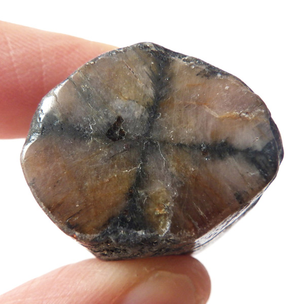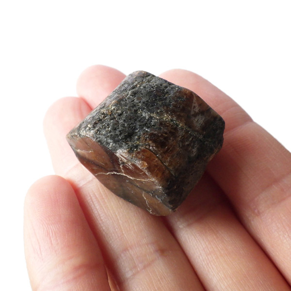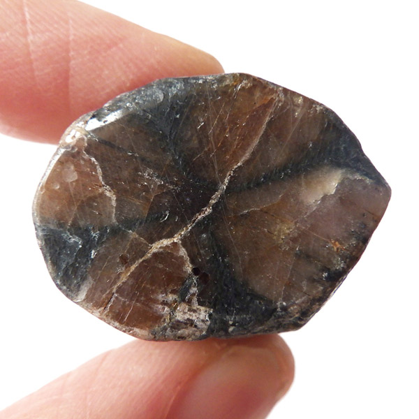 ブラジル産、キャストライト磨き原石です。キャストライトは濃いブラウンに黒の十字模様が大変魅力的な石です。キャストライトの名前は、輪切りにすると黒い十字の模様が現れることから、ギリシャ語で「対角線的な配列」という意味の「Chiastos」に由来しています。キャストライトは、黒鉛(グラファイト)などの黒色含有物を対称的に含んだ紅柱石です。クロスストーンとも呼ばれ、粘板岩と花こう岩の接触部に産出します。黒の十字が目を引く一方、茶色のサイド面の結晶がキラキラと美しく見えるのも魅力的です。