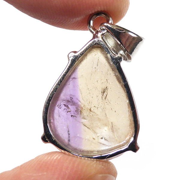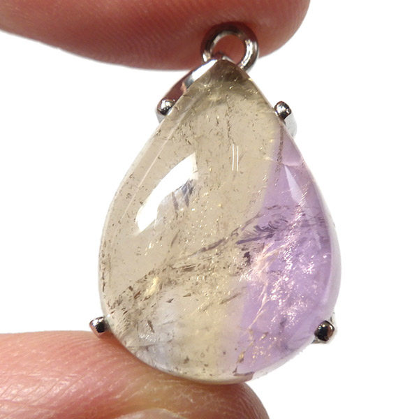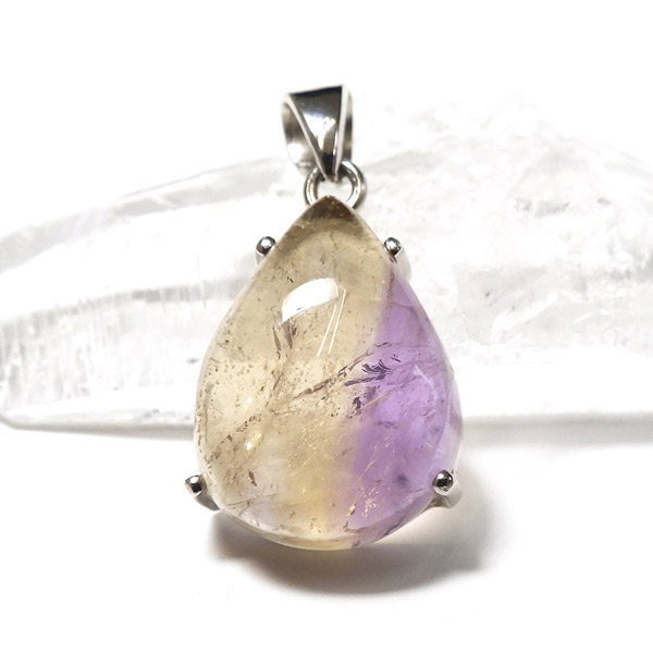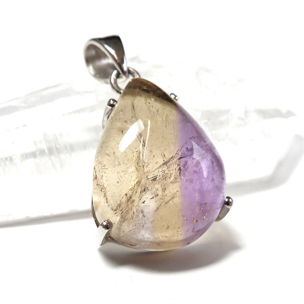 アメトリンのしずく形ペンダントトップです。アメトリンはアメジストとシトリンが混ざり合った、非常に魅力的な色彩を持つ石です。イエローとパープルのバイカラーがとてもきれいです。是非、光に当てて中を覗き込んでみてください。 透明度、発色は良好のかわいらしいペンダントトップです。