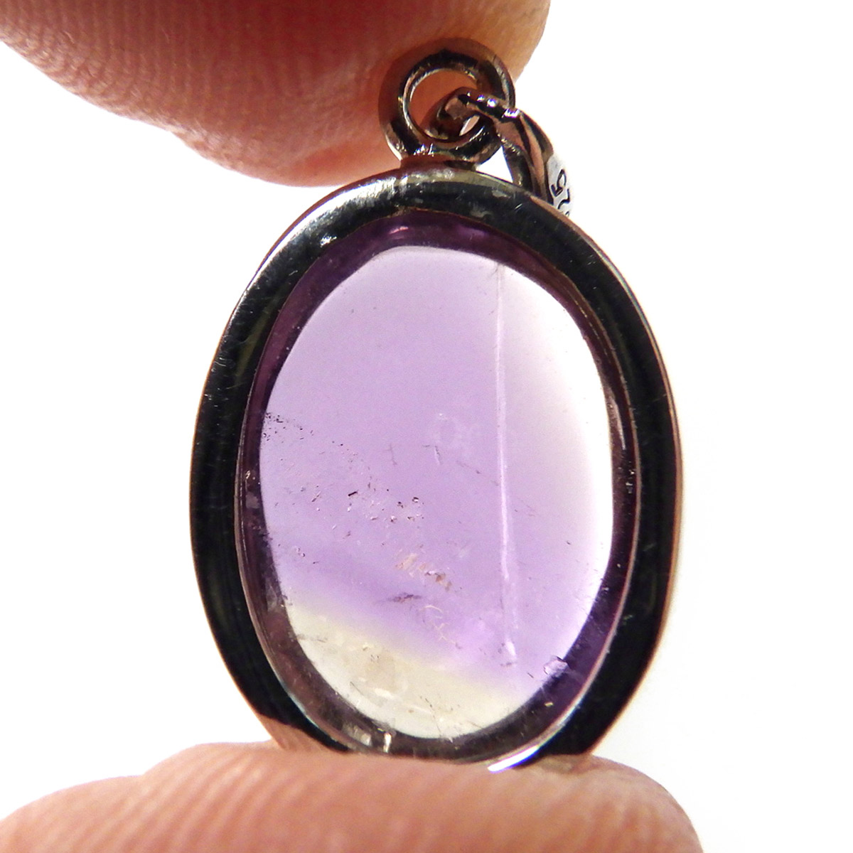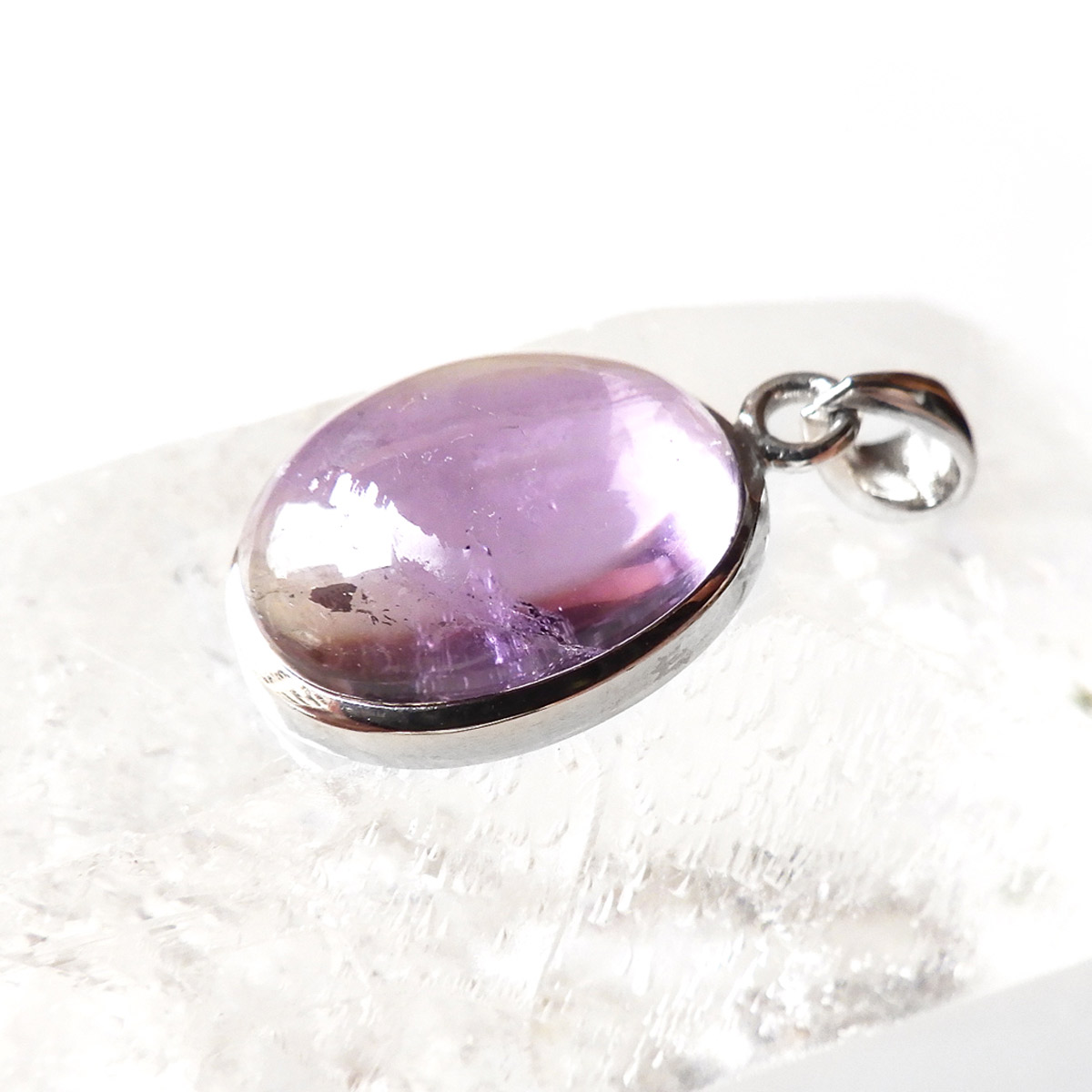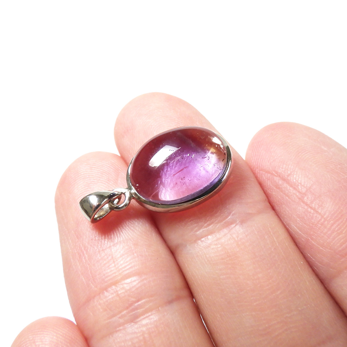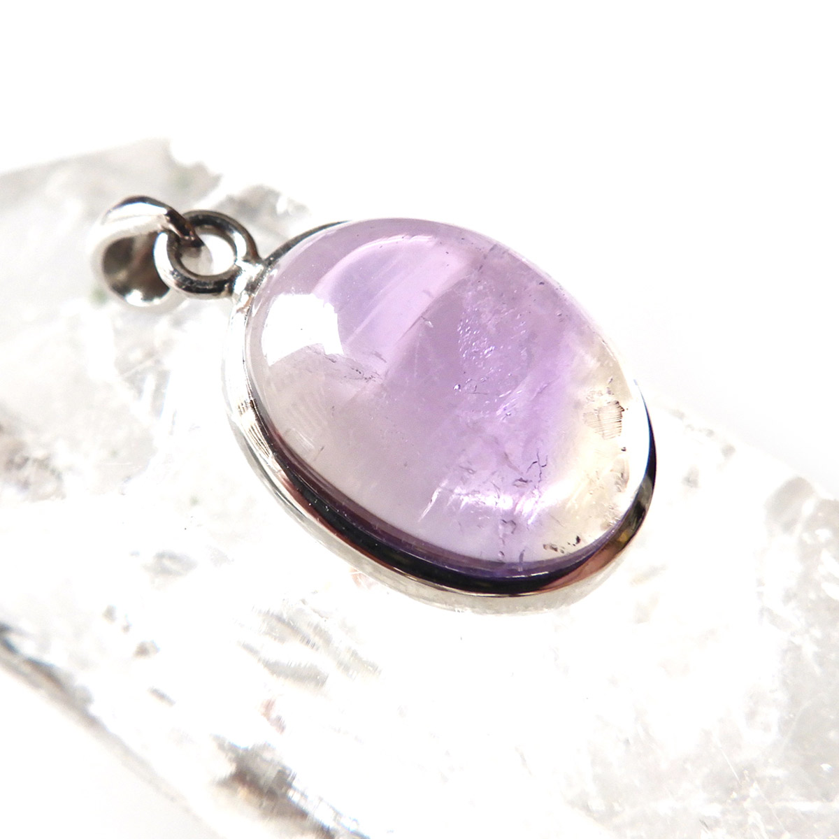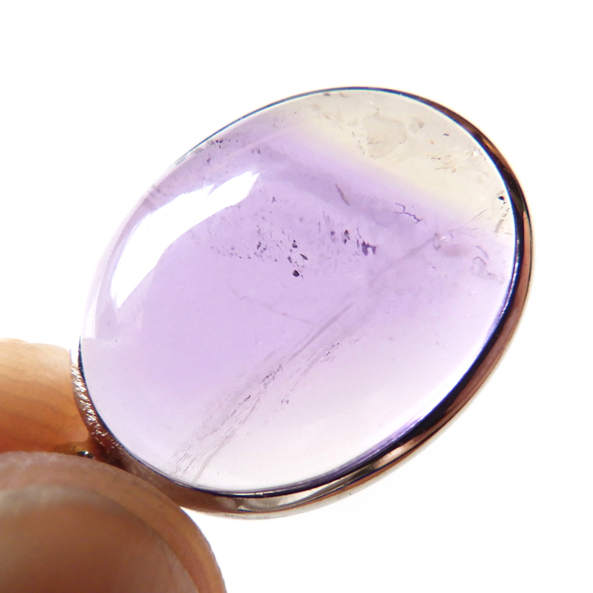 アメトリンのオーバル形ペンダントトップです。アメトリンはアメジストとシトリンが混ざり合った、非常に魅力的な色彩を持つ石です。イエローとパープルのバイカラーがとてもきれいです。是非、光に当てて中を覗き込んでみてください。 透明度、発色は良好のかわいらしいペンダントトップです。