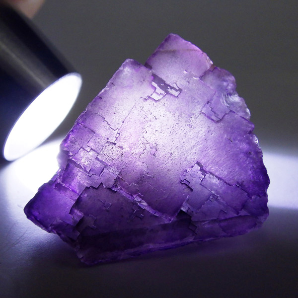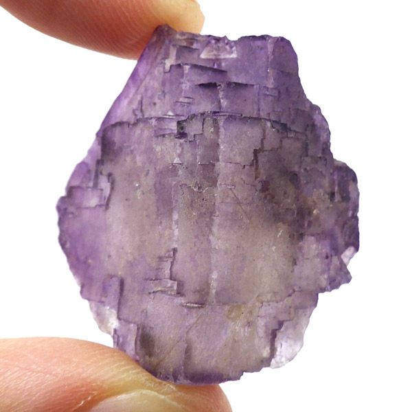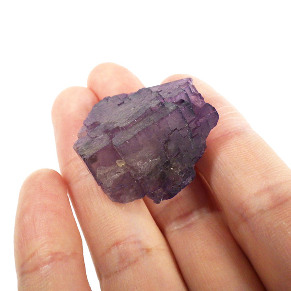 メキシコ産のパープルフローライト原石です。結晶の形が細かく、表面にびっしりと幾何学模様が刻まれています。先端に行く程、パープルが濃くなっていくのが特徴的。光にかざすと半透明で幻想的です。