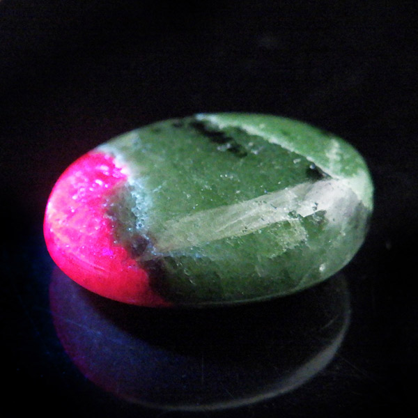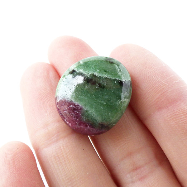 インド産ルビーインゾイサイトのタンブルです。濃緑色のゾイサイトの中に濃紅色のルビーが入っています。赤系の石、特にルビーはとても貴重な天然石です。ルビーインゾイサイトは別名アニョライトと呼ばれています。マサイ族の言葉で緑を意味するアニョリが由来とされています。ブラックライトを照射することでルビーレッドが鮮やかに蛍光します。