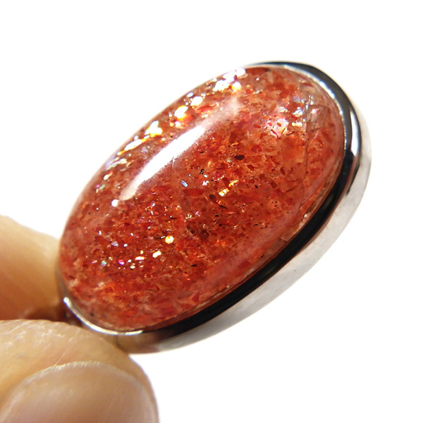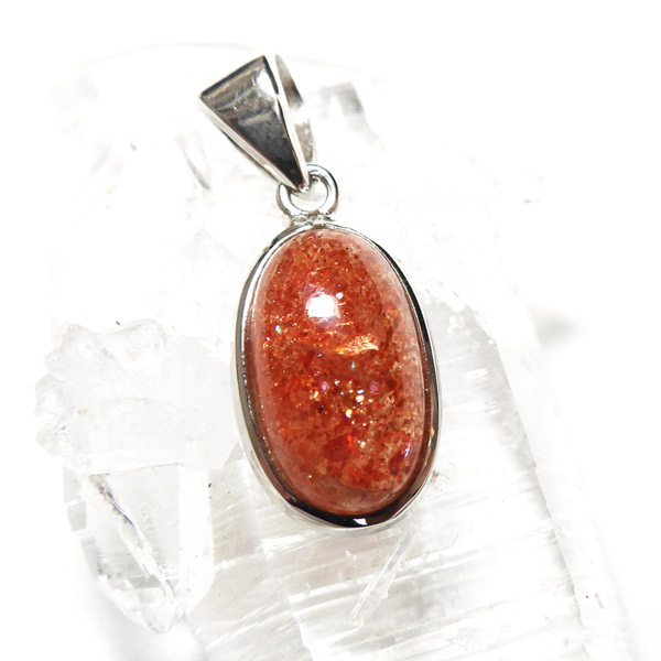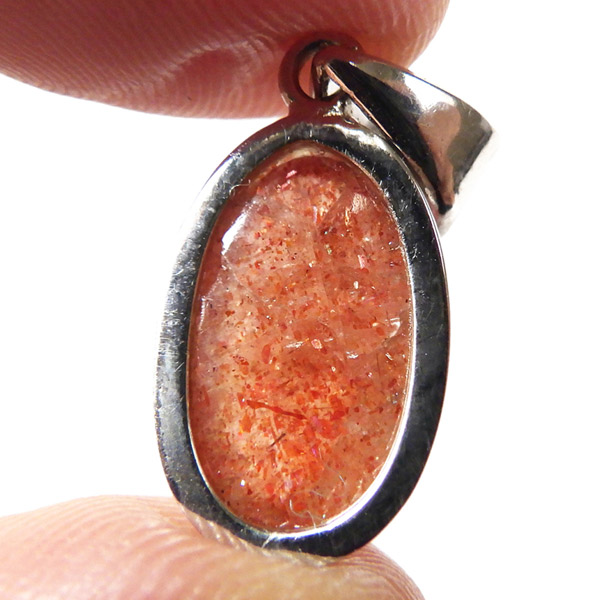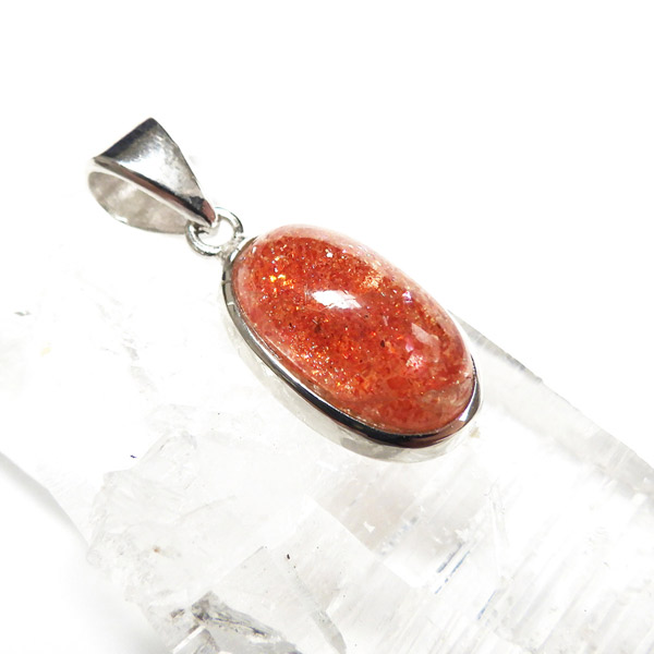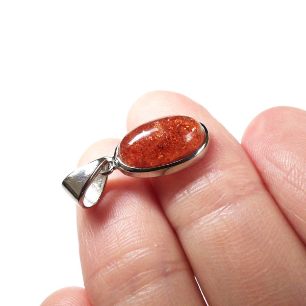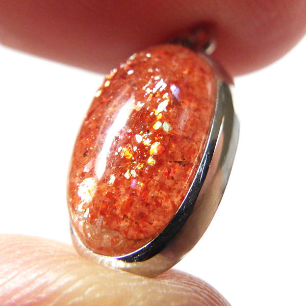 インド産のサンストーン、ペンダントトップです。 灼熱の太陽を彷彿とするオレンジ色のキラキラした石、 それがサンストーンです。太陽のように表面が輝き、キメの細かいマイカのキラキラとした光が魅力的に現れます。 ぷっくり楕円形で可愛らしいペンダントトップです。