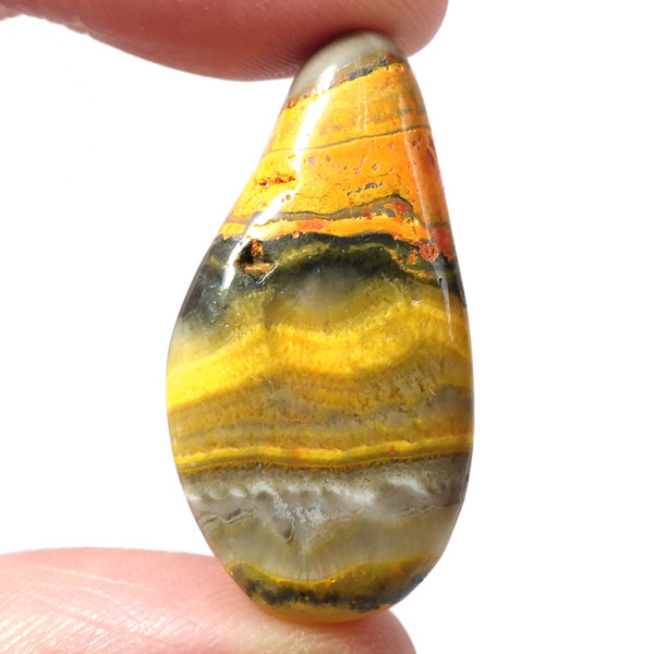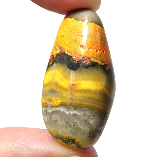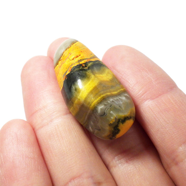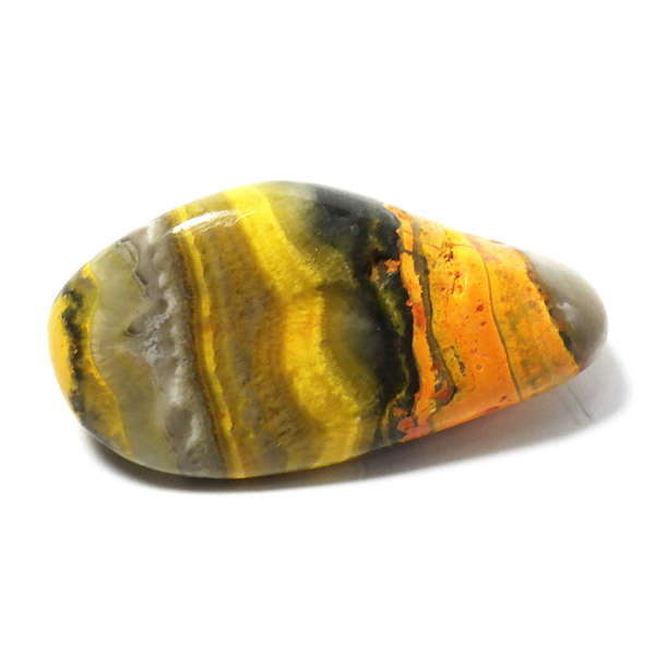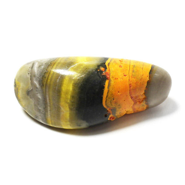 インドネシア産のバンブルビージャスパー、タンブルです。発色とグラデーションが美しいものを選りすぐりました。バンブルビージャスパー、別名エクリプスとも呼ばれます。「バンブルビー」とは、ミツバチの一種のマルハナバチのことで、黒地に蛍光色のイエローの模様からこの名前がつけられました。また、「エクリプス」とは、皆既日食を意味しています。主に硫黄がビビッドな発色を生み出すと言われ、クォーツと他の微量ミネラルで構成されています。