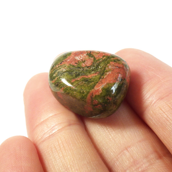 エピドート(緑簾石)、クローライト(緑泥石)、フェルドスパー(長石)、クォーツ(石英)の混合石で、アメリカのノースカロライナ州のユナカ山地が原産地で、地名に因んで名付けられました。変質して出来た火成岩で、緑色が強いもの、ピンクが多めに入ったものなど個体差があり、その独特な色合いと模様がおもしろいです。
