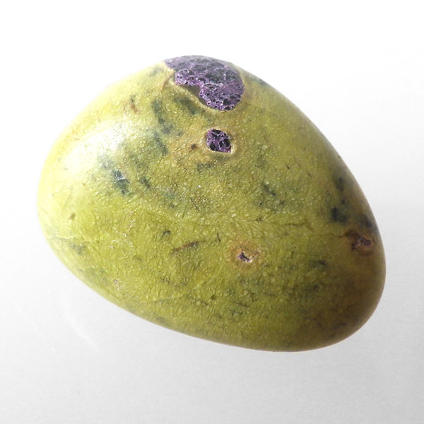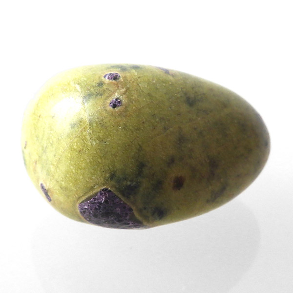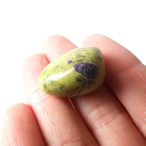 オーストラリア産のアトランティサイト、タンブルです。 鮮やかな黄緑のサーペンティン(リザーダイト)に、またまた鮮やかな紫色のスティヒタイトが点々と彩りを添え、色彩のハーモニーが美しく印象的です。 クリスタルヒーラーのメロディ氏によって紹介されたヒーリングストーンのひとつです。 産地に因んでタスマナイトとも呼ばれています。アトランティサイトの名の由来は、伝説の大国「アトランティス」から。この叡智にアクセスできるというこの奇跡のクリスタルは、ヒーリングの分野のみならず、標本業界にも多大なインパクトを与えました。大変希少性が高く近年流通量が減少しつつあるパワーストーンの一つとなります。