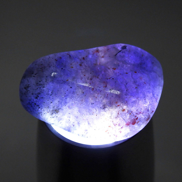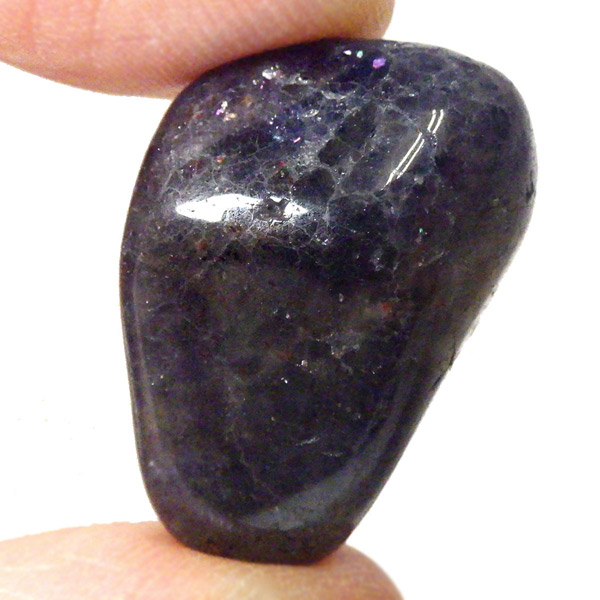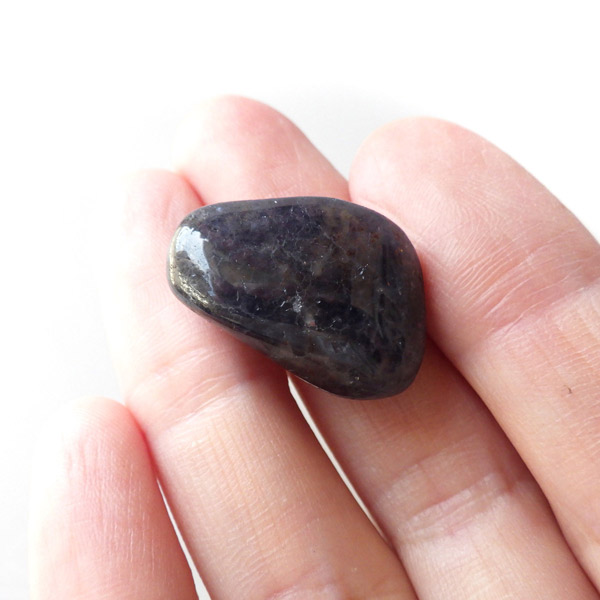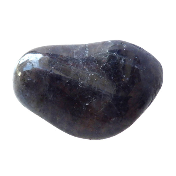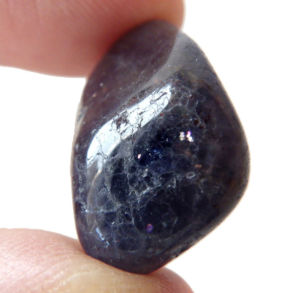 インド産のアイオライト、タンブルです。アイオライトは見る角度によって色が変化するという神秘的な鉱石です。広域変成岩や接触変成岩などで発見されるケイ酸塩鉱物の一種で、多色性が強く、見る角度によって群青色から淡い枯れ草色に変化します。透明度こそ高くはありませんが、光に透かすとブラッドショットと呼ばれる赤い斑点が見られるブラッドショットアイオライトとも呼ばれています。