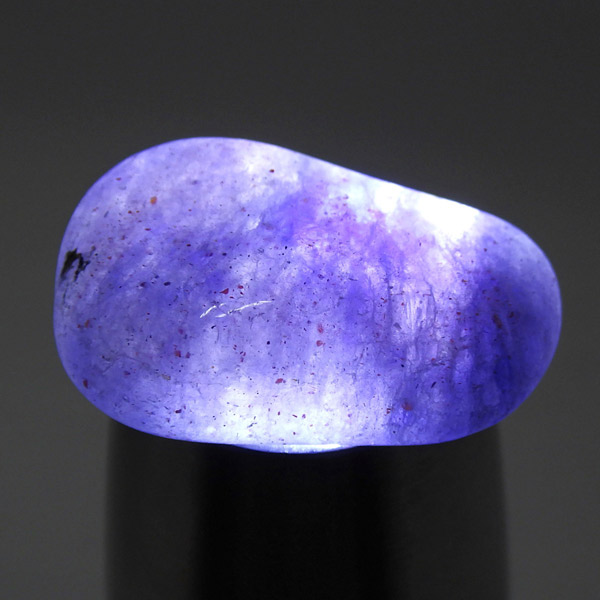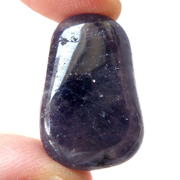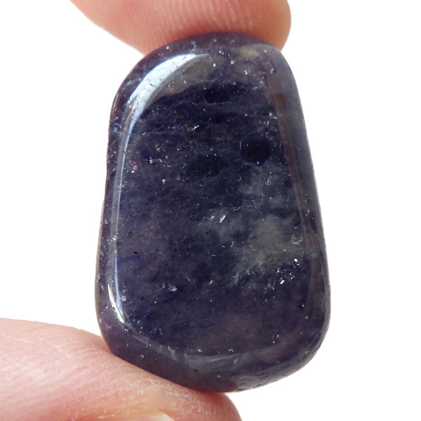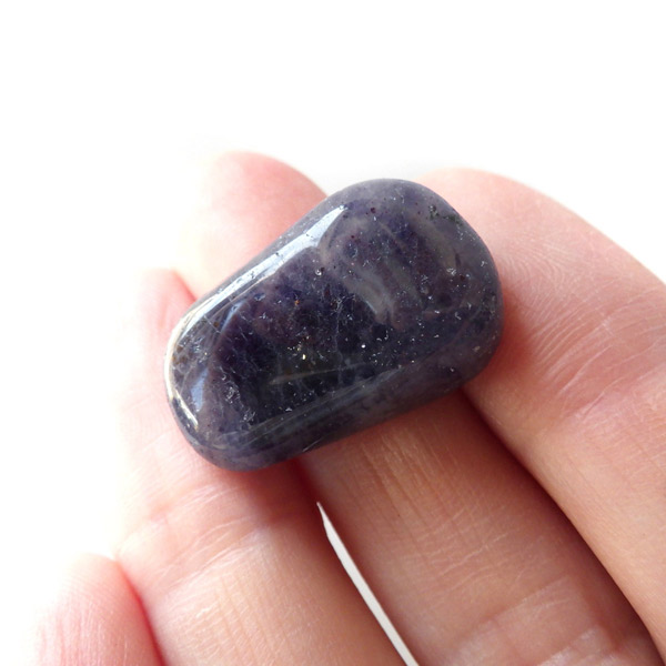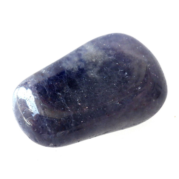 インド産のアイオライト、タンブルです。アイオライトは見る角度によって色が変化するという神秘的な鉱石です。広域変成岩や接触変成岩などで発見されるケイ酸塩鉱物の一種で、多色性が強く、見る角度によって群青色から淡い枯れ草色に変化します。透明度こそ高くはありませんが、光に透かすとブラッドショットと呼ばれる赤い斑点が見られるブラッドショットアイオライトとも呼ばれています。