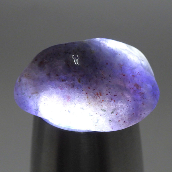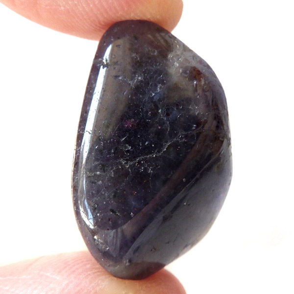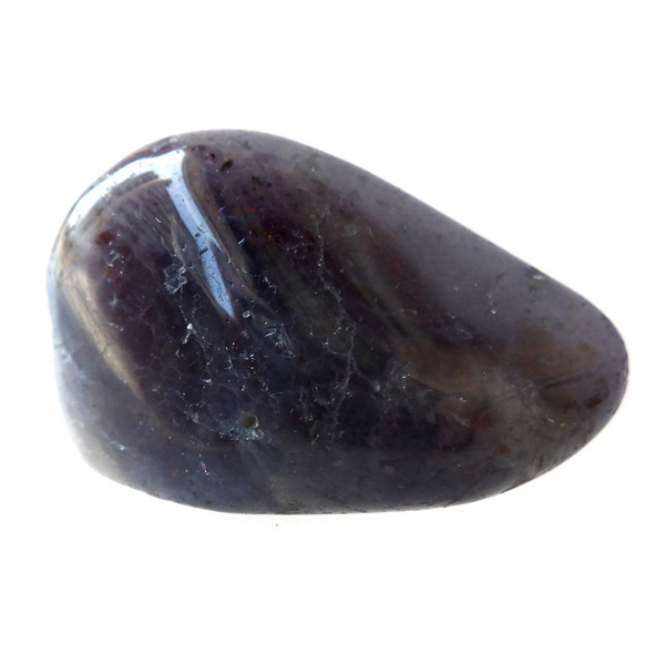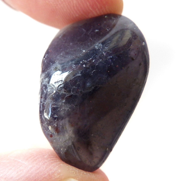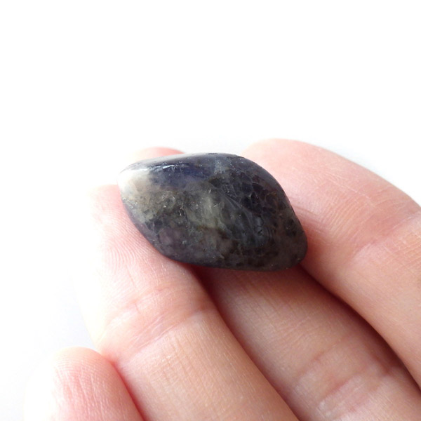 インド産のアイオライト、タンブルです。アイオライトは見る角度によって色が変化するという神秘的な鉱石です。広域変成岩や接触変成岩などで発見されるケイ酸塩鉱物の一種で、多色性が強く、見る角度によって群青色から淡い枯れ草色に変化します。透明度こそ高くはありませんが、光に透かすとブラッドショットと呼ばれる赤い斑点が見られるブラッドショットアイオライトとも呼ばれています。