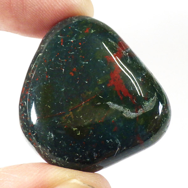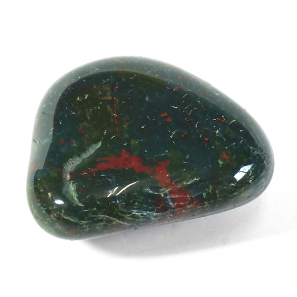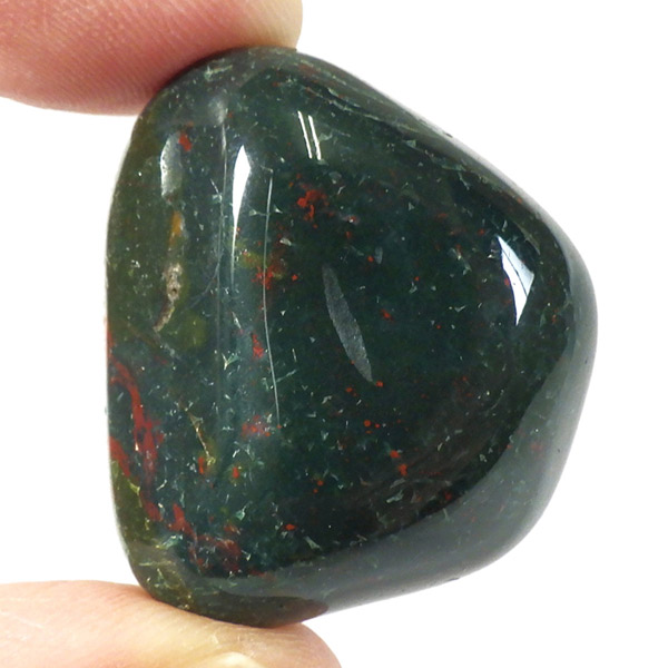 インド産のブラッドストーン、タンブルです。ブラッドストーンはジャスパーの一種で濃緑色の地に赤い斑点や模様の入った石です。鉄に起因する赤い斑点が見られる石で、赤斑点が血の様に見られることからブラッドストーンと呼ばれています。