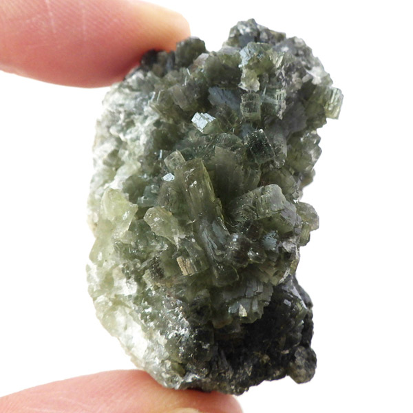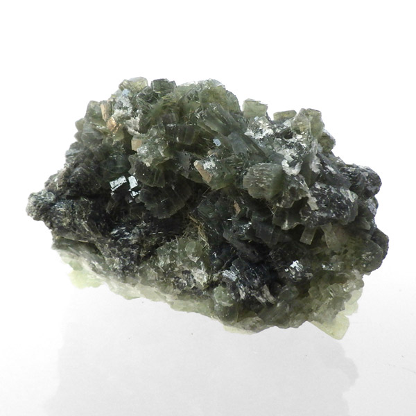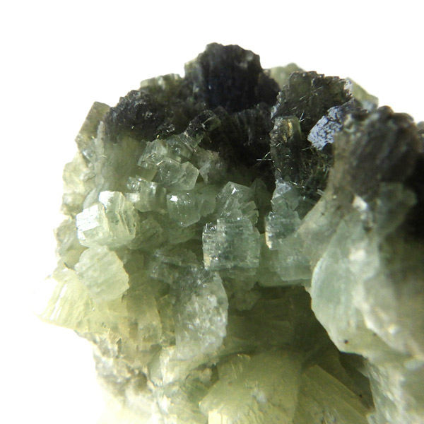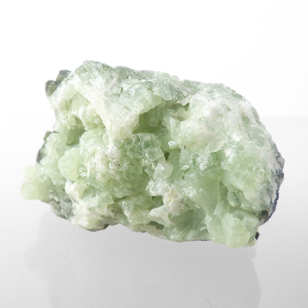 モロッコ産のプレナイト、原石です。プレナイトは、淡い緑から緑色にかけての色合いの石。1788年に南アフリカで初めてこの石を発見したフォン・プレーン大佐にちなんで名付けられました。葡萄石という和名は、産出時に見た目が葡萄のようであったことから名づけられました。多くのプレナイトは葡萄のような丸っこいフォルムをしていますが、稀にこちらの原石の様に短柱状から板状の集合体で産出されます。小さな柱状の結晶が無数に集合した珍しい状態の原石です。濃い緑と淡い緑のバイカラープレナイトになっています。