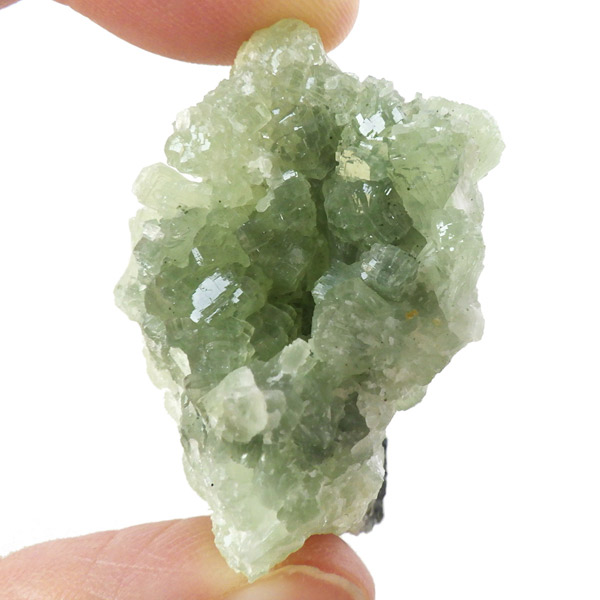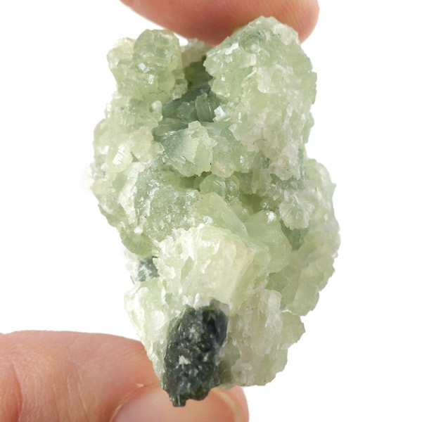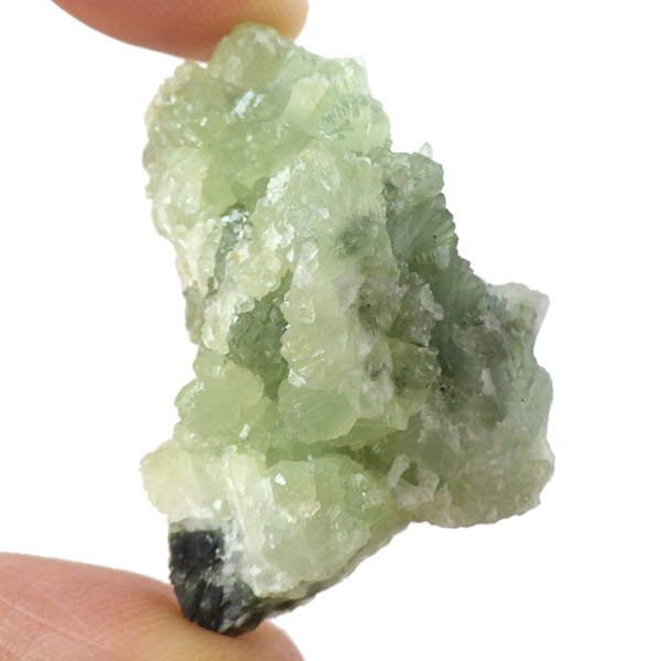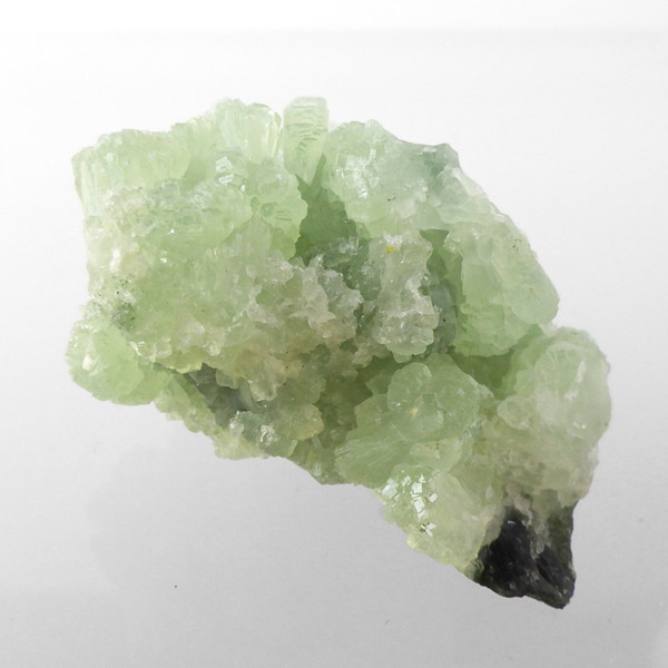 モロッコ産のプレナイト、原石です。プレナイトは、淡い緑から緑色にかけての色合いの石。1788年に南アフリカで初めてこの石を発見したフォン・プレーン大佐にちなんで名付けられました。葡萄石という和名は、産出時に見た目が葡萄のようであったことから名づけられました。多くのプレナイトは葡萄のような丸っこいフォルムをしていますが、稀にこちらの原石の様に短柱状から板状の集合体で産出されます。小さな柱状の結晶が無数に集合した珍しい状態の原石です。