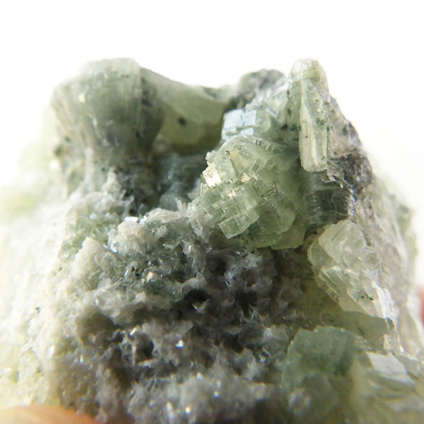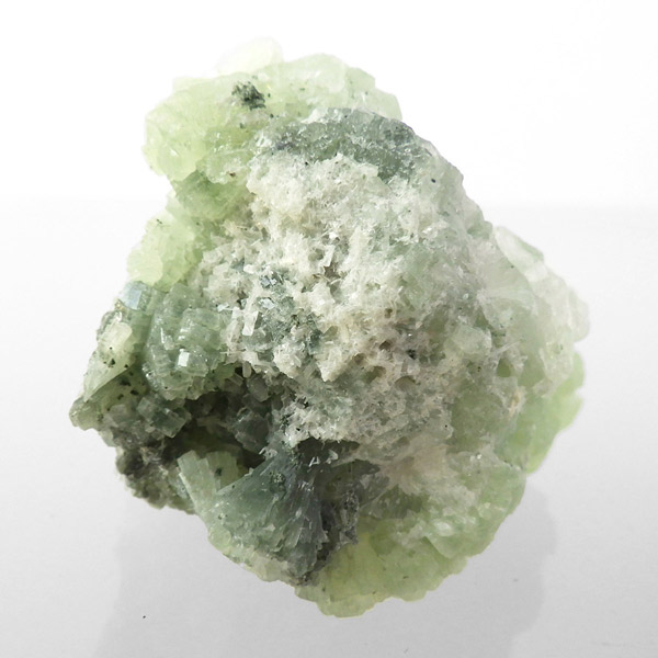 モロッコ産のプレナイト、原石です。プレナイトは、淡い緑から緑色にかけての色合いの石。1788年に南アフリカで初めてこの石を発見したフォン・プレーン大佐にちなんで名付けられました。葡萄石という和名は、産出時に見た目が葡萄のようであったことから名づけられました。多くのプレナイトは葡萄のような丸っこいフォルムをしていますが、稀にこちらの原石の様に短柱状から板状の集合体で産出されます。小さな柱状の結晶が無数に集合した珍しい状態の原石です。