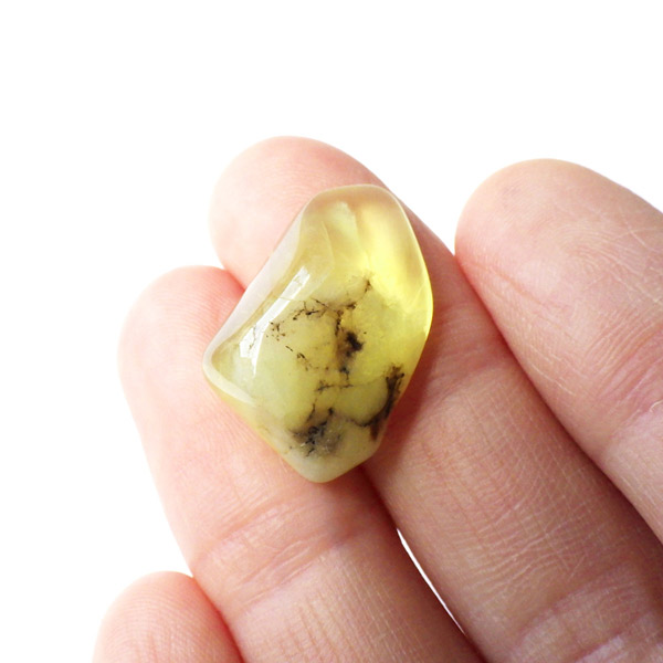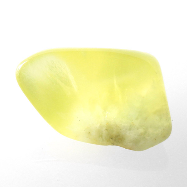 オーストラリア産のイエロープレナイト、タンブルです。和名でぶどう石(葡萄石)と呼ばれており、プレナイトの多くはぶどうの房のような形状で産出します。プレナイトと言えば、和名で「ぶどう石」と呼ばれるようにマスカットカラーが特徴の石ですが、ビビッドなイエローのプレナイトは大変希少です。皮を剥いたみずみずしいぶどうのような、シャインイエローの美しいタンブルです。