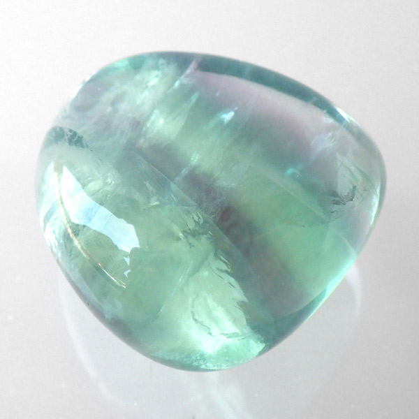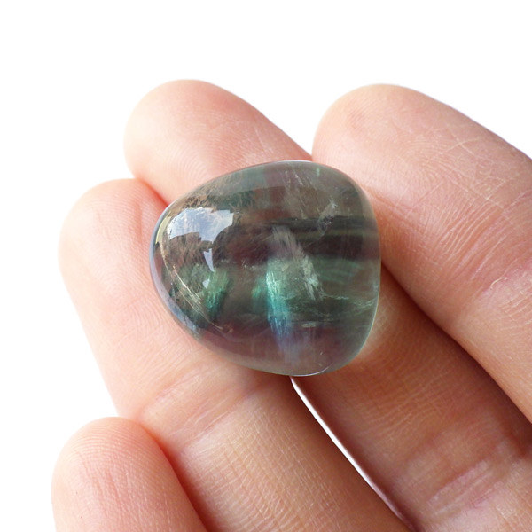 チャイナ産フローライトのタンブルです。 大変透明度が高く、いろいろなカラーの色彩が見られます。蛍石の名前の通り、様々な角度からその美しさを楽しむことができます。光にかざして透かすと、カラーが複雑に入り乱れており、そのグラデーションが大変きれいです。小さいながらにきれいで透明度が高く、心動かされたフローライトのご紹介になります。