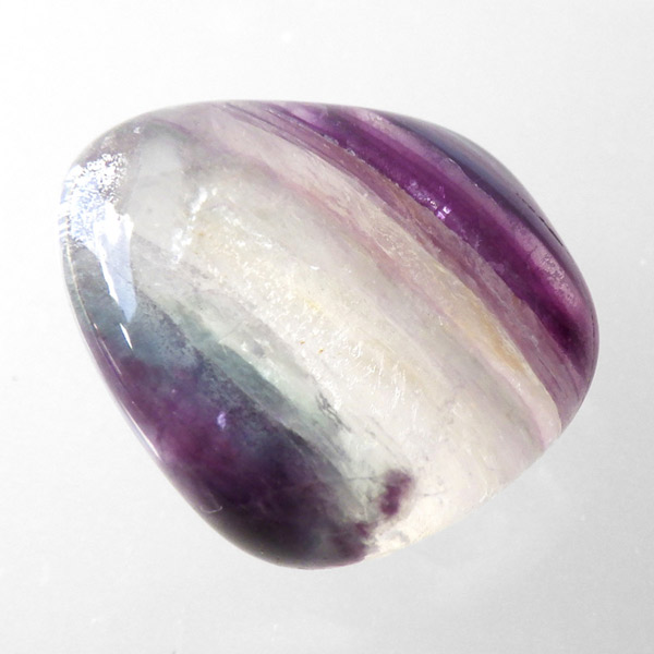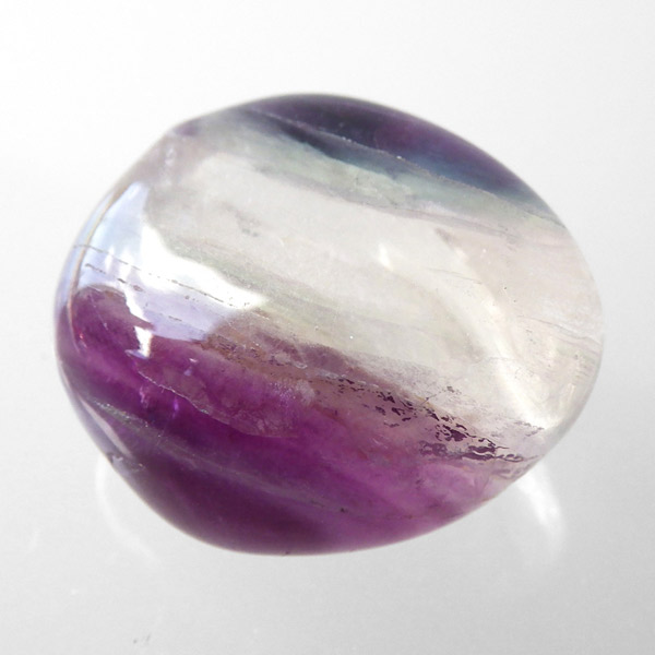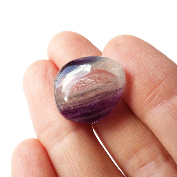 チャイナ産フローライトのタンブルです。 大変透明度が高く、いろいろなカラーの色彩が見られます。蛍石の名前の通り、様々な角度からその美しさを楽しむことができます。光にかざして透かすと、カラーが複雑に入り乱れており、そのグラデーションが大変きれいです。小さいながらにきれいで透明度が高く、心動かされたフローライトのご紹介になります。