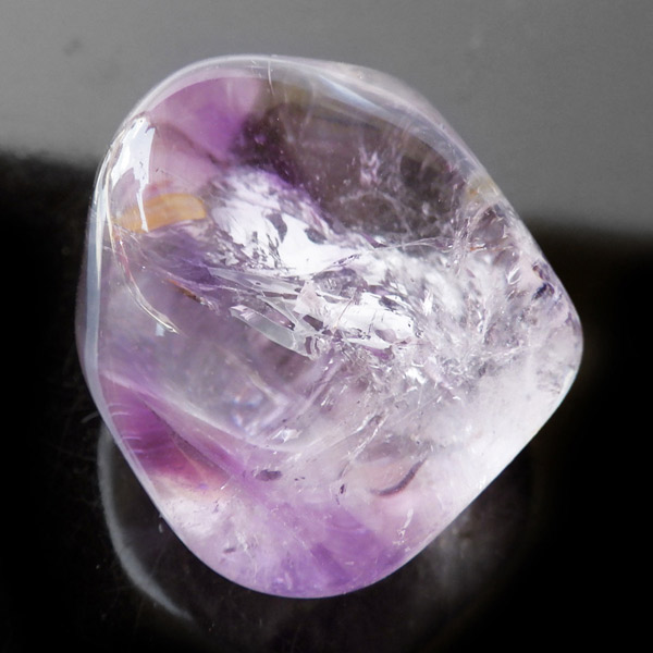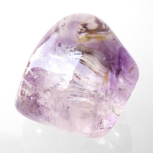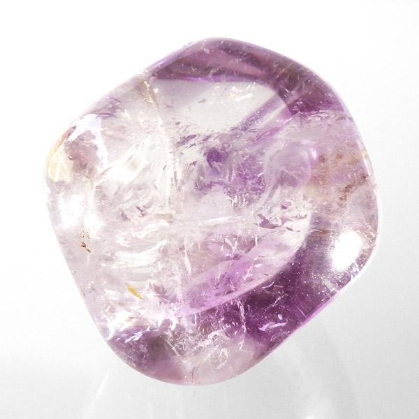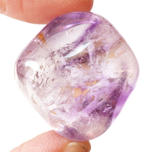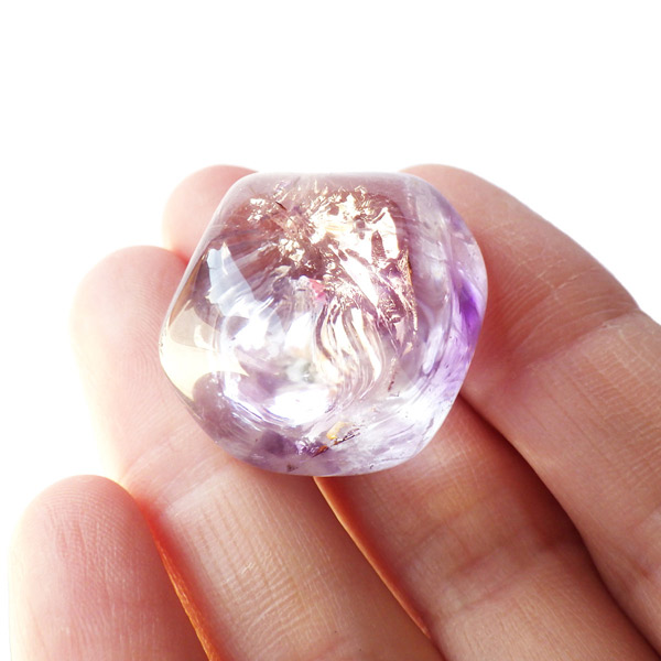ブラジル産アメジストエレスチャル、タンブルです。エレスチャルは、水晶グループの中でも特に長い時間をかけて、特殊な成長過程を経て形成されたもののことを指し、「水晶の最終形態」とも言われています。エレスチャルの中でも、水晶の中にアメジスト部分が多く入っているものをアメジストエレスチャルと呼びます。非常に美しいインクルージョンでレインボーも確認できました。光に透かすと美しく、やっぱりいいなと見惚れてしまいます。透明度が高く紫色も濃いものは、なかなか手に入らないのでおすすめです。