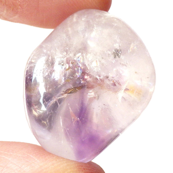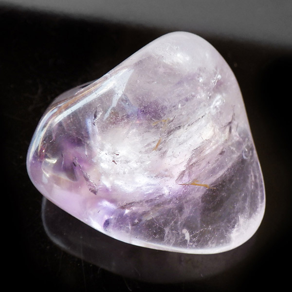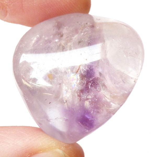 ブラジル産アメジストエレスチャル、タンブルです。エレスチャルは、水晶グループの中でも特に長い時間をかけて、特殊な成長過程を経て形成されたもののことを指し、「水晶の最終形態」とも言われています。エレスチャルの中でも、水晶の中にアメジスト部分が多く入っているものをアメジストエレスチャルと呼びます。非常に美しいインクルージョンでレインボーも確認できました。光に透かすと美しく、やっぱりいいなと見惚れてしまいます。透明度が高く紫色も濃いものは、なかなか手に入らないのでおすすめです。