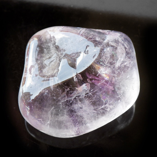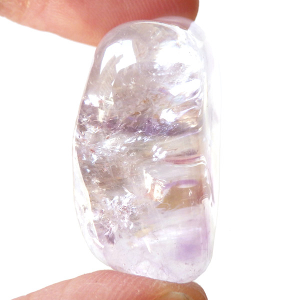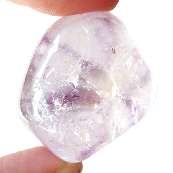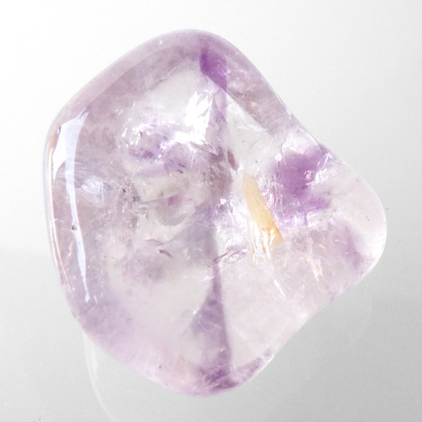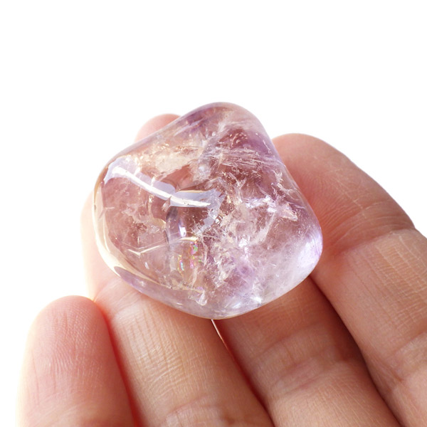 ブラジル産アメジストエレスチャル、タンブルです。エレスチャルは、水晶グループの中でも特に長い時間をかけて、特殊な成長過程を経て形成されたもののことを指し、「水晶の最終形態」とも言われています。エレスチャルの中でも、水晶の中にアメジスト部分が多く入っているものをアメジストエレスチャルと呼びます。非常に美しいインクルージョンでレインボーも確認できました。光に透かすと美しく、やっぱりいいなと見惚れてしまいます。透明度が高く紫色も濃いものは、なかなか手に入らないのでおすすめです。