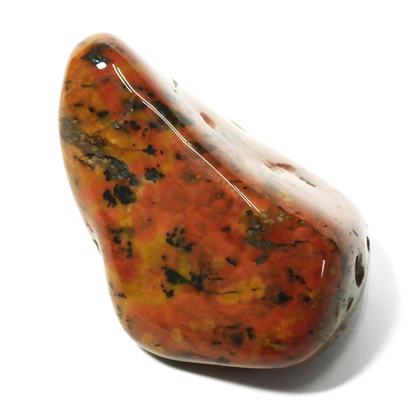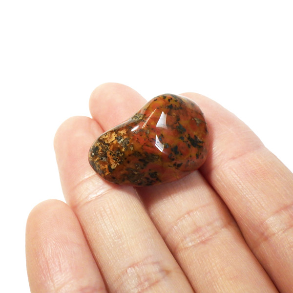 メキシコ産のタイガーテールジャスパー、タンブルです。タイガーテールジャスパーは主に黄色味と赤みを帯び、黒の斑点が見られる石で、虎の尻尾のように見えることから名付けられた愛称です。タイガーアイに似た石と思いますが、タイガーアイのようなシャトヤンシー(光学効果)は出ません。黄褐色や赤褐色は鉄に由来して色付いています。黒い部分は金属光沢が見られるヘマタイト(赤鉄鉱)です。模様と色味が独特で、多様な表情が見られる面白い石です。