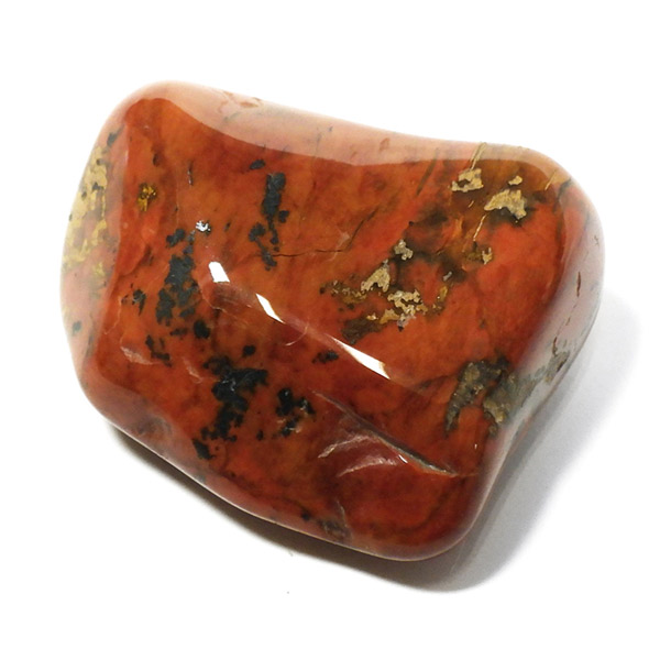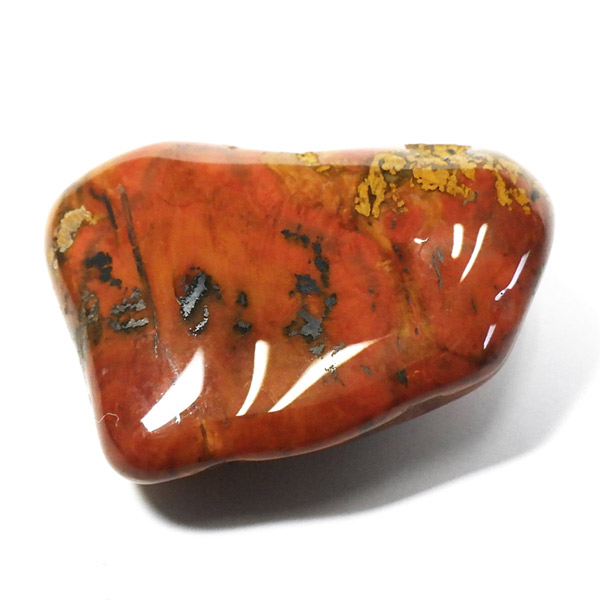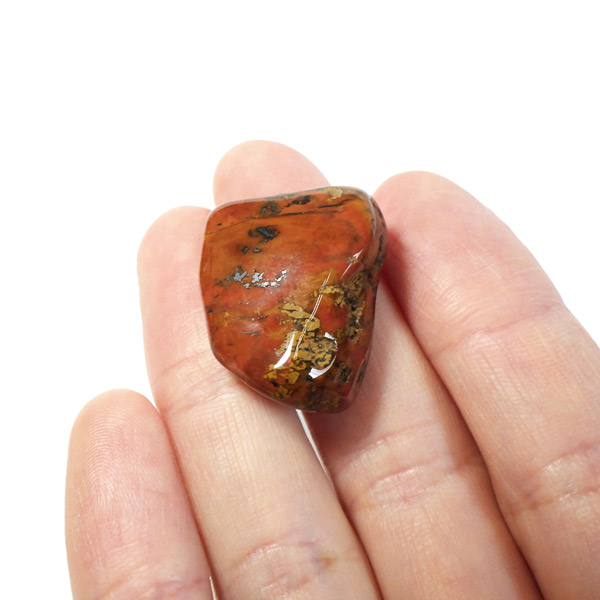 メキシコ産のタイガーテールジャスパー、タンブルです。タイガーテールジャスパーは主に黄色味と赤みを帯び、黒の斑点が見られる石で、虎の尻尾のように見えることから名付けられた愛称です。タイガーアイに似た石と思いますが、タイガーアイのようなシャトヤンシー(光学効果)は出ません。黄褐色や赤褐色は鉄に由来して色付いています。黒い部分は金属光沢が見られるヘマタイト(赤鉄鉱)です。模様と色味が独特で、多様な表情が見られる面白い石です。