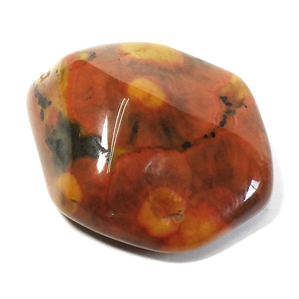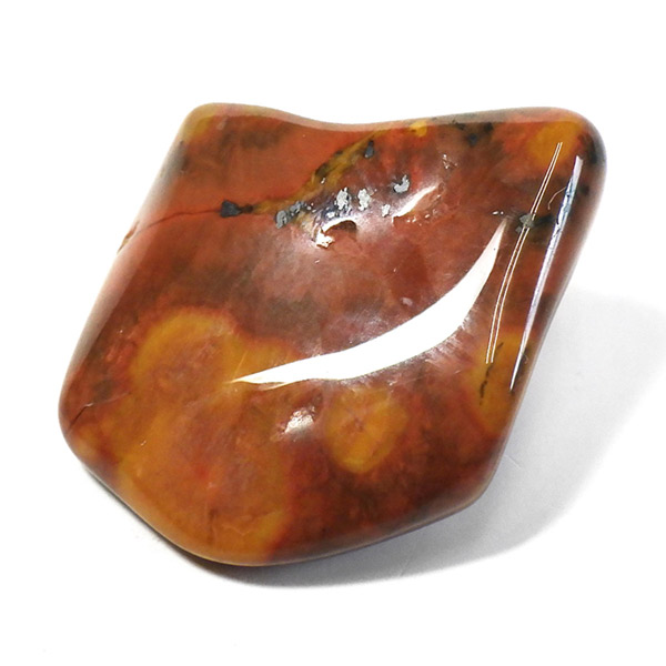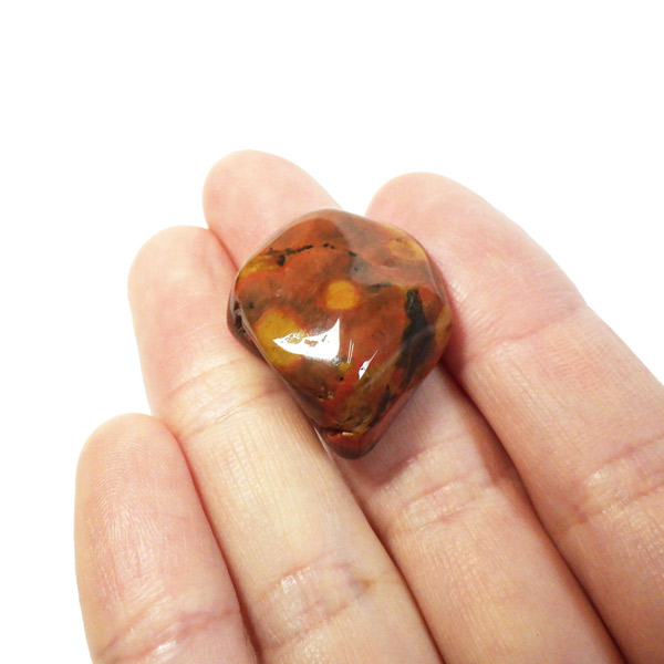 メキシコ産のタイガーテールジャスパー、タンブルです。タイガーテールジャスパーは主に黄色味と赤みを帯び、黒の斑点が見られる石で、虎の尻尾のように見えることから名付けられた愛称です。タイガーアイに似た石と思いますが、タイガーアイのようなシャトヤンシー(光学効果)は出ません。黄褐色や赤褐色は鉄に由来して色付いています。黒い部分は金属光沢が見られるヘマタイト(赤鉄鉱)です。模様と色味が独特で、多様な表情が見られる面白い石です。