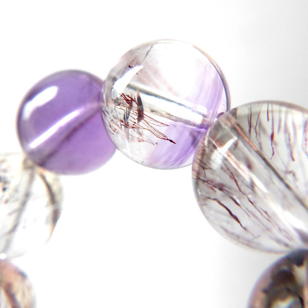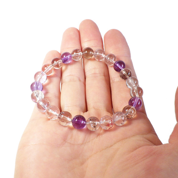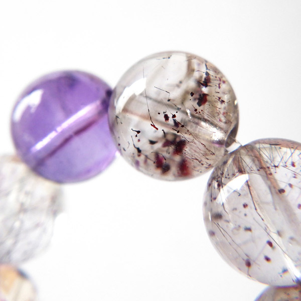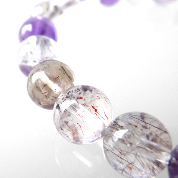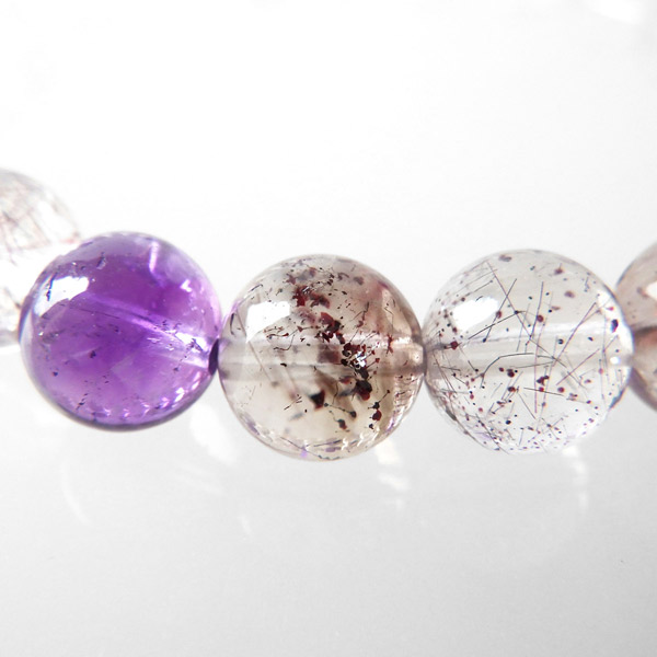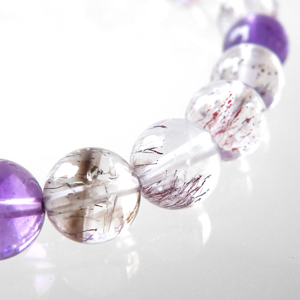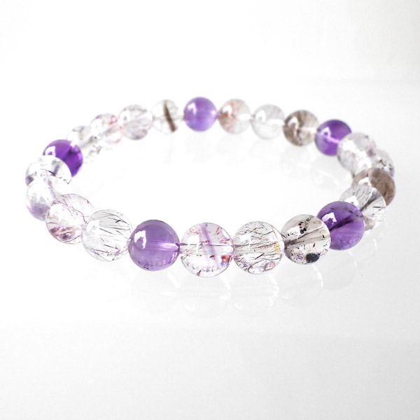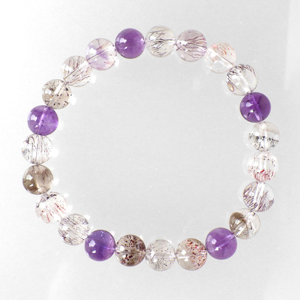 スーパーセブン(セイクリッドセブン)は、「水晶」「アメジスト」「カコクセナイト」「ゲーサイト」「レピドクロサイト」「スモーキークォーツ」「ルチルクォーツ」の7つの鉱物が集まった石です。アメリカの有名なクリスタルヒーラーであるA・メロディー女史 が「スーパーセブン」と名付けて紹介したことで、有名になりました。品質も良く、とても神秘的で美しさに魅了されるブレスレットです。