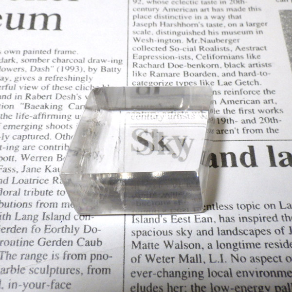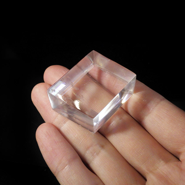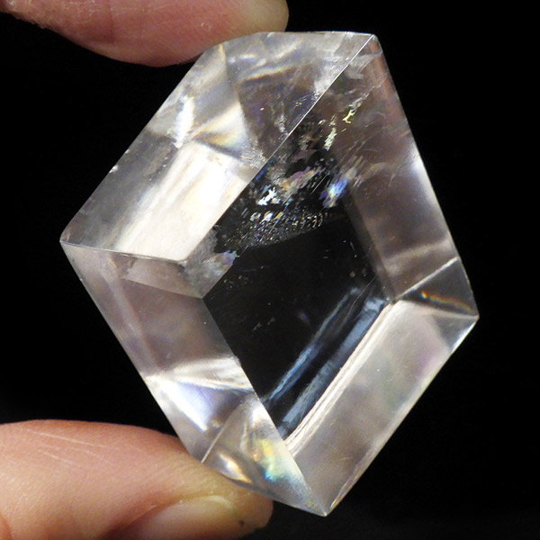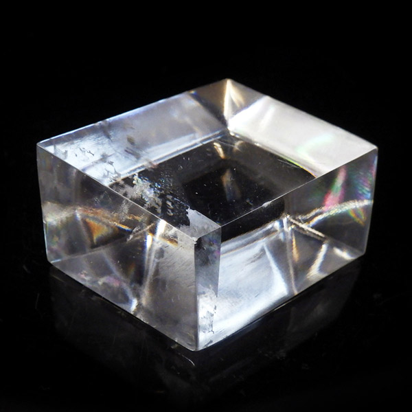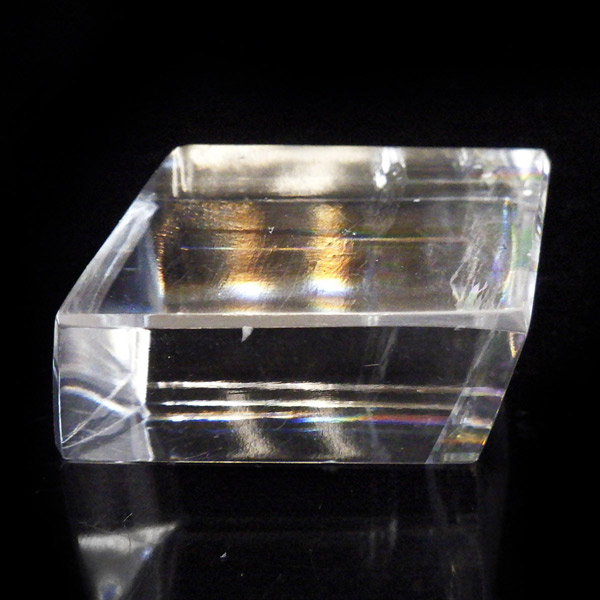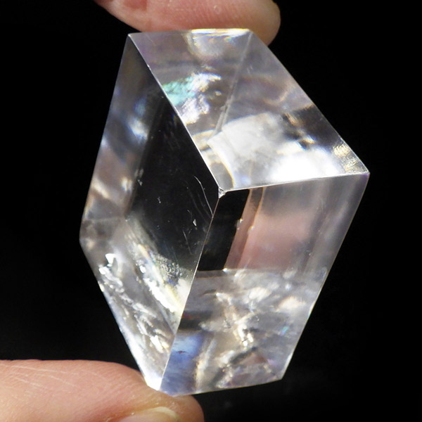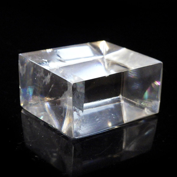 マダガスカル産のオプティカルカルサイトです。無色透明で良質のカルサイトのことをオプティカルカルサイトと呼びます。高い透明度を持ち、様々な角度からレインボーを見ることができます。複屈折という光学現象を持ち、文字の上に載せると二つにダブって見える「ダブリング(二重像現象)」のような現象を起こします。一定方向に向かって割れる劈開性によって平行四辺形の形になります。 他の産地のものよりマダガスカル産のオプティカルカルサイトはクラックが少なくきれいな印象です。