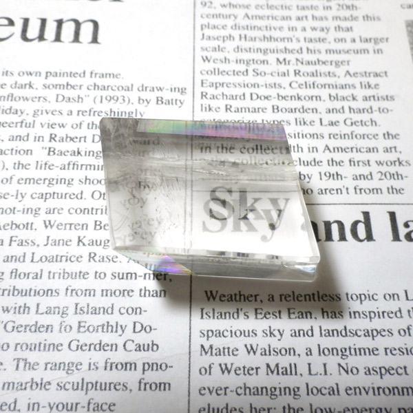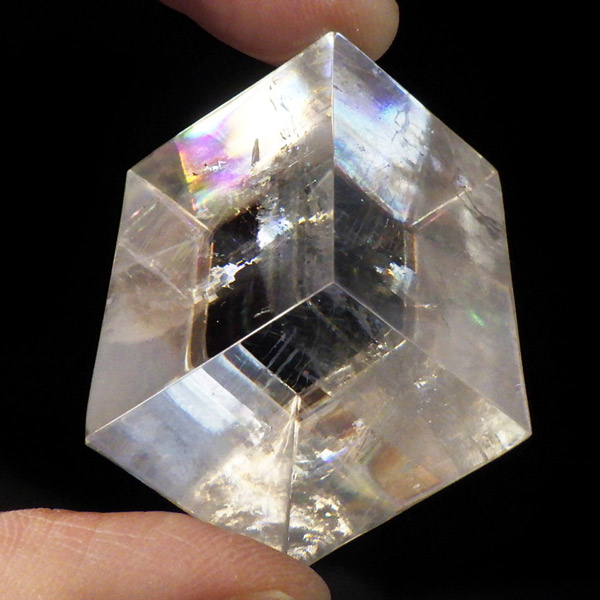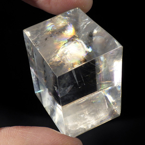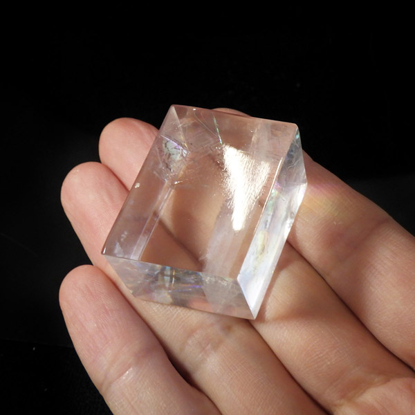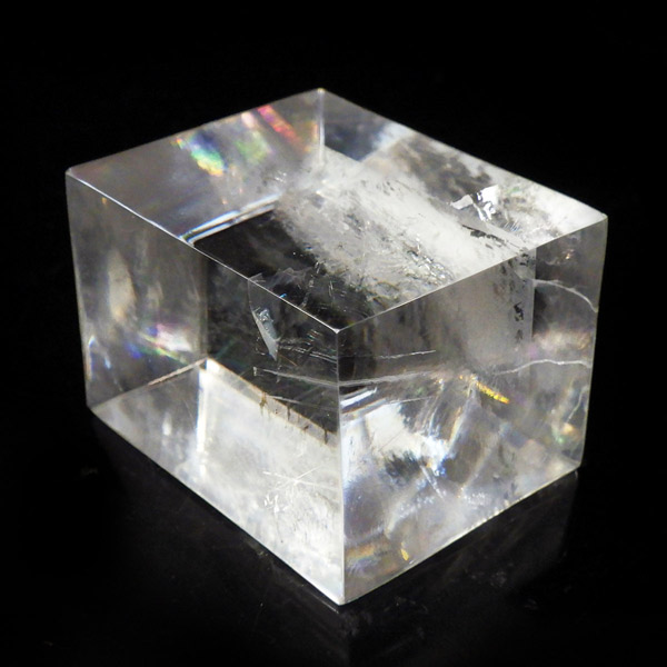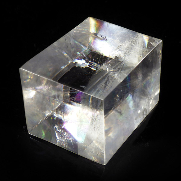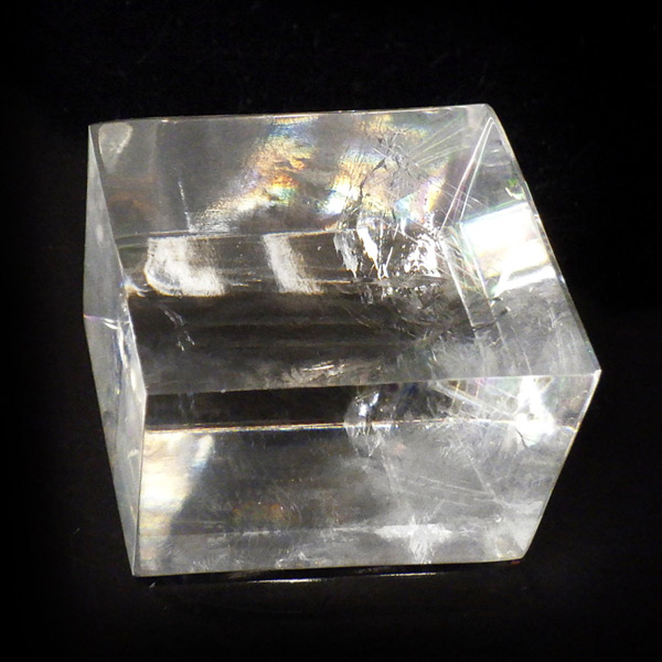 マダガスカル産のオプティカルカルサイトです。無色透明で良質のカルサイトのことをオプティカルカルサイトと呼びます。高い透明度を持ち、様々な角度からレインボーを見ることができます。複屈折という光学現象を持ち、文字の上に載せると二つにダブって見える「ダブリング(二重像現象)」のような現象を起こします。一定方向に向かって割れる劈開性によって平行四辺形の形になります。 他の産地のものよりマダガスカル産のオプティカルカルサイトはクラックが少なくきれいな印象です。