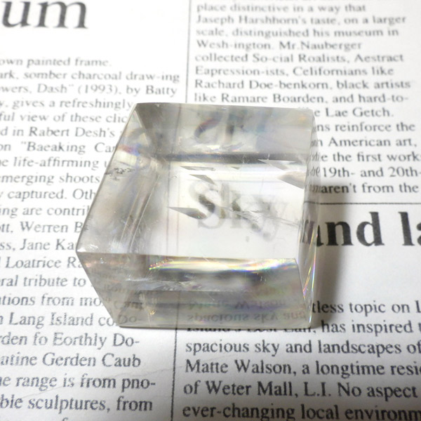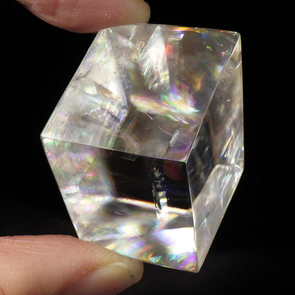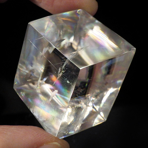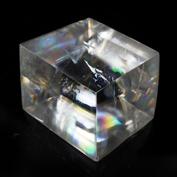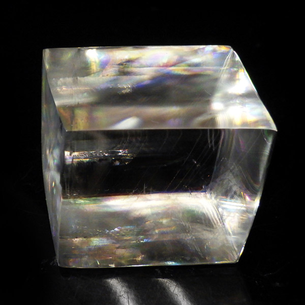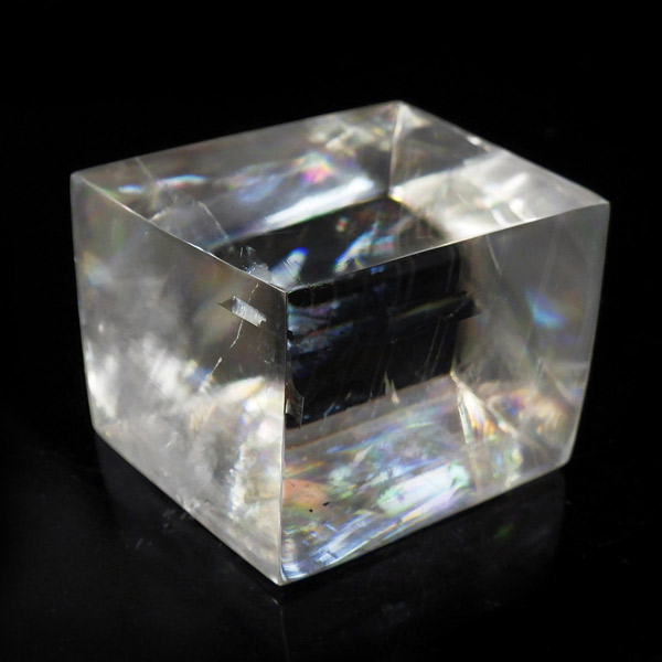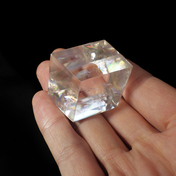 マダガスカル産のオプティカルカルサイトです。無色透明で良質のカルサイトのことをオプティカルカルサイトと呼びます。高い透明度を持ち、様々な角度からレインボーを見ることができます。複屈折という光学現象を持ち、文字の上に載せると二つにダブって見える「ダブリング(二重像現象)」のような現象を起こします。一定方向に向かって割れる劈開性によって平行四辺形の形になります。 他の産地のものよりマダガスカル産のオプティカルカルサイトはクラックが少なくきれいな印象です。
