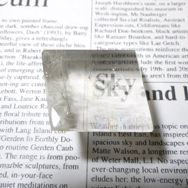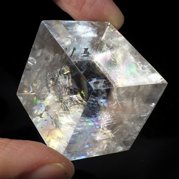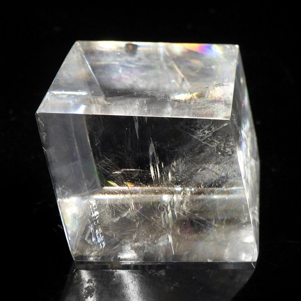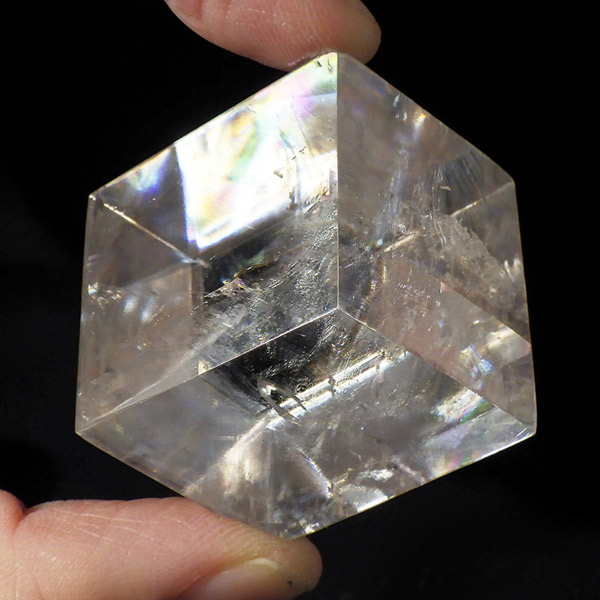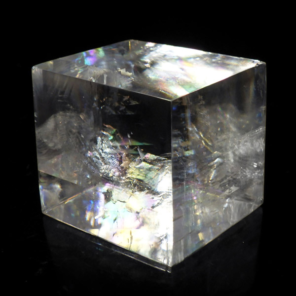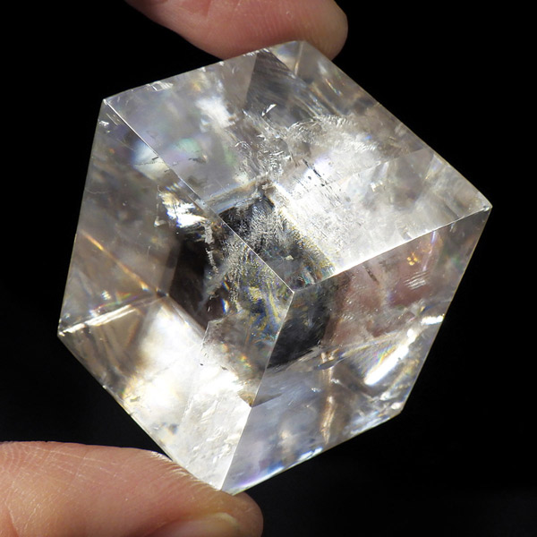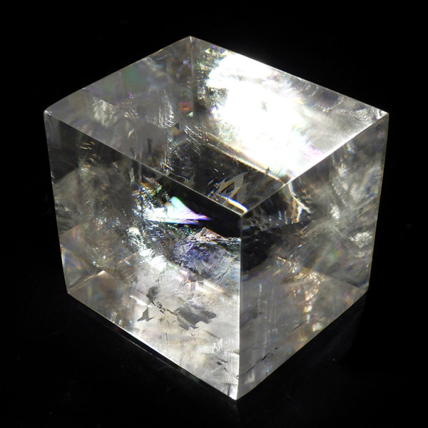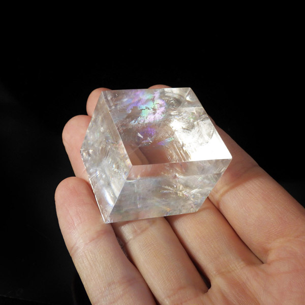 マダガスカル産のオプティカルカルサイトです。無色透明で良質のカルサイトのことをオプティカルカルサイトと呼びます。高い透明度を持ち、様々な角度からレインボーを見ることができます。複屈折という光学現象を持ち、文字の上に載せると二つにダブって見える「ダブリング(二重像現象)」のような現象を起こします。一定方向に向かって割れる劈開性によって平行四辺形の形になります。 他の産地のものよりマダガスカル産のオプティカルカルサイトはクラックが少なくきれいな印象です。