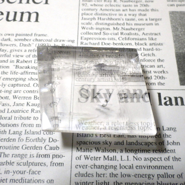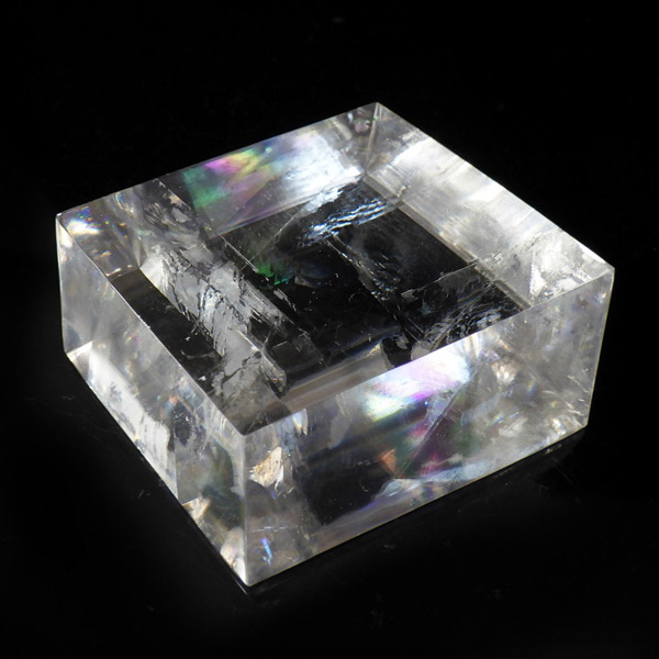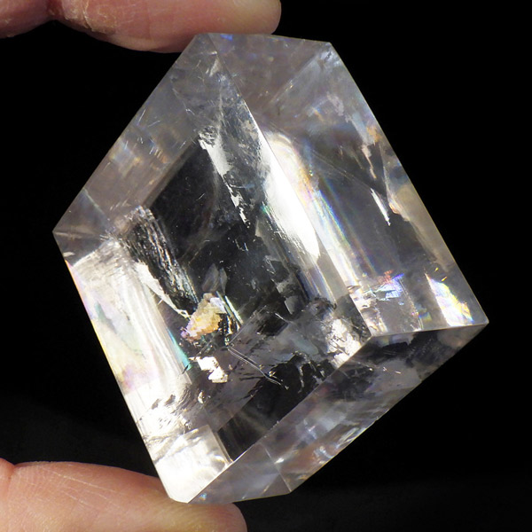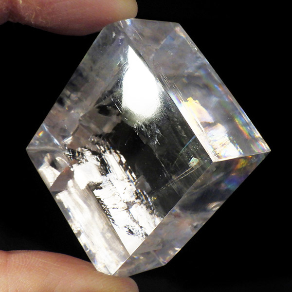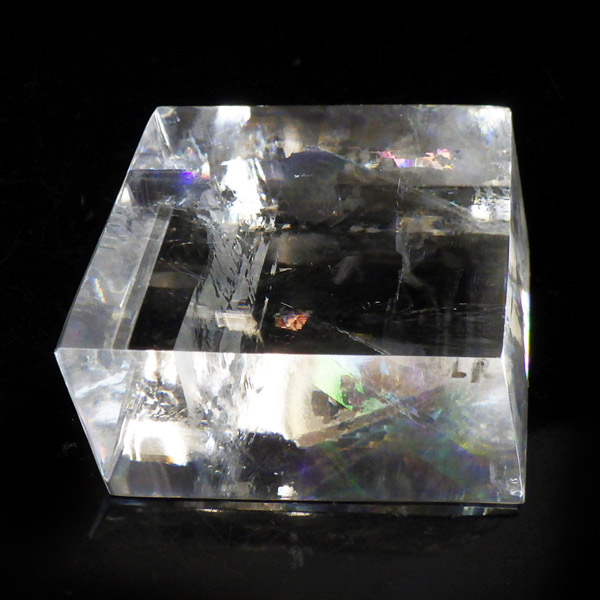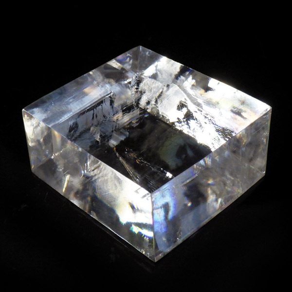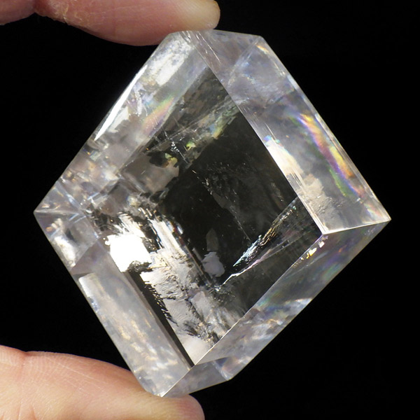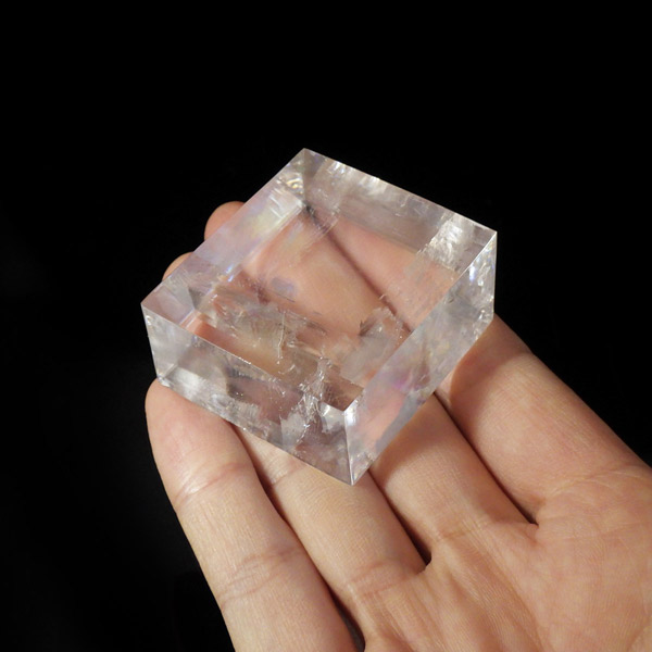 マダガスカル産のオプティカルカルサイトです。無色透明で良質のカルサイトのことをオプティカルカルサイトと呼びます。高い透明度を持ち、様々な角度からレインボーを見ることができます。複屈折という光学現象を持ち、文字の上に載せると二つにダブって見える「ダブリング(二重像現象)」のような現象を起こします。一定方向に向かって割れる劈開性によって平行四辺形の形になります。 他の産地のものよりマダガスカル産のオプティカルカルサイトはクラックが少なくきれいな印象です。