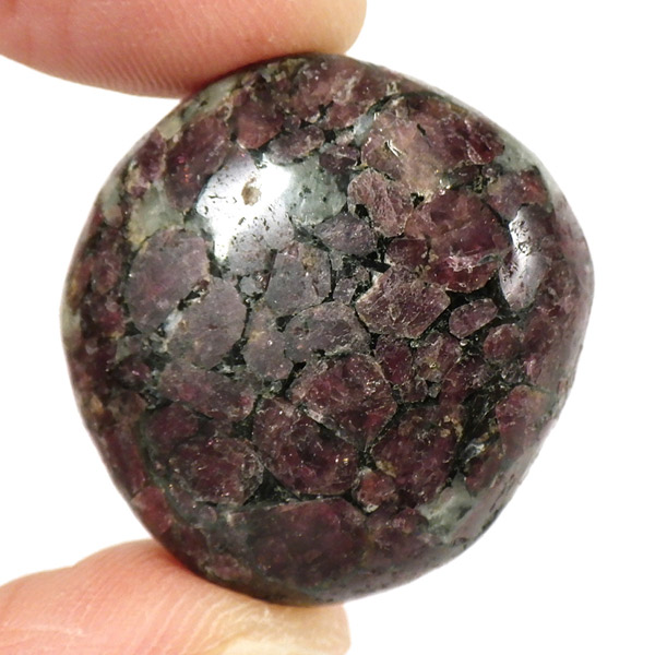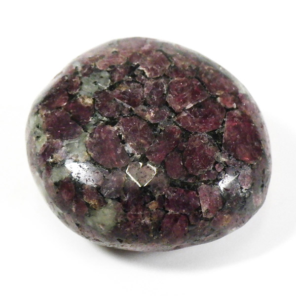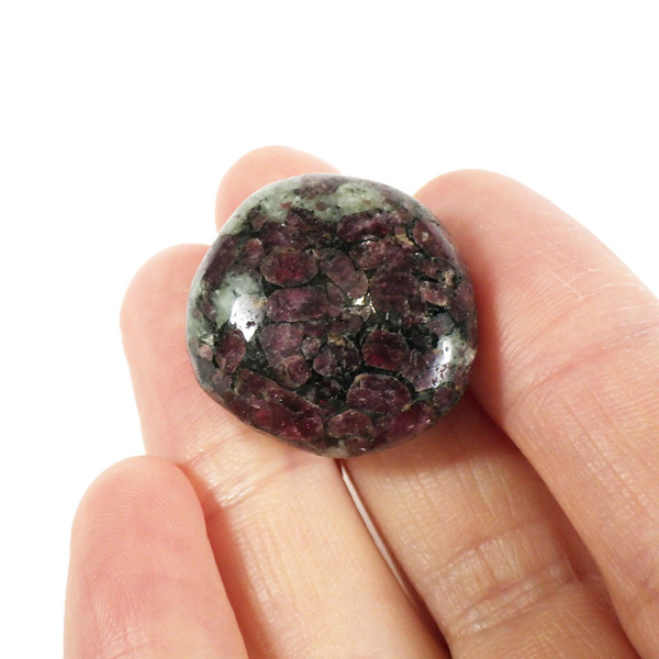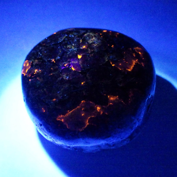 ロシア産のユーディアライト、タンブルです。産出量の少ない希少な石。深いワインレッドとキラキラとした結晶がとてもきれいで、神秘的な輝きを放ちます。赤い色が鮮やかであるほど貴重で、産地であるロシア・ラップランドではラップランドのルビーという愛称があります。ユーディアライトではない母岩部分(おそらくソーダライト)が365nmの波長で蛍光しました。