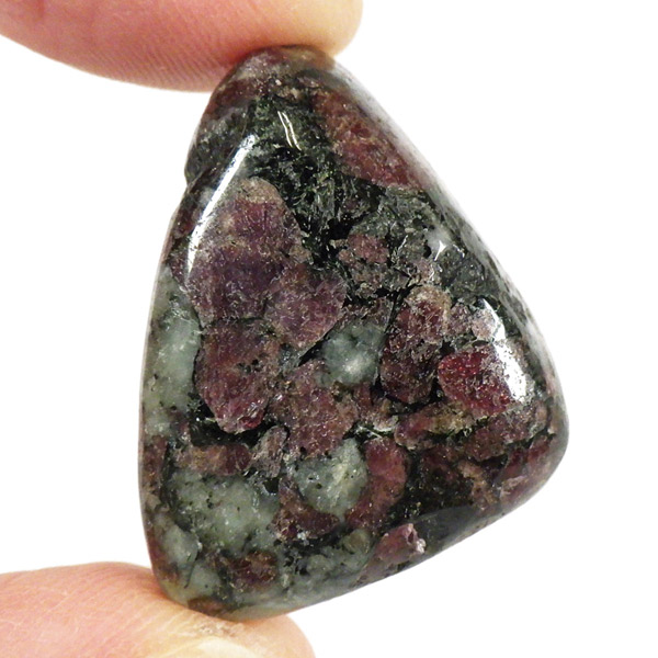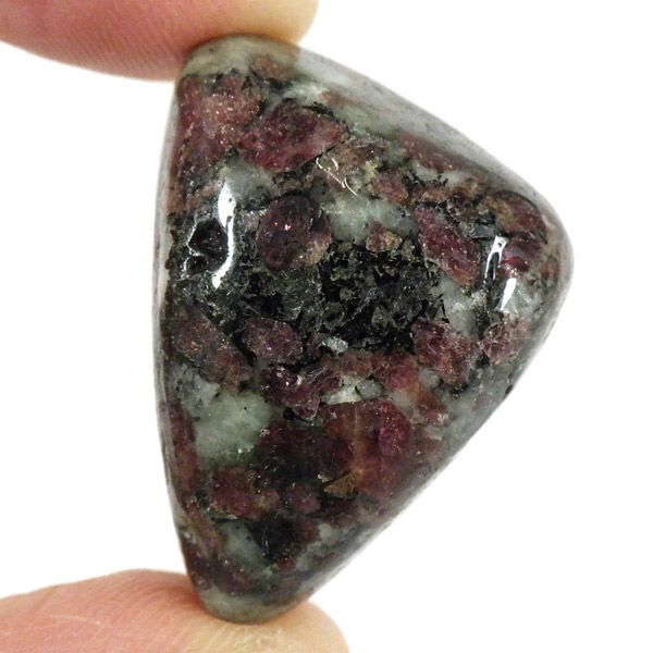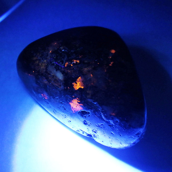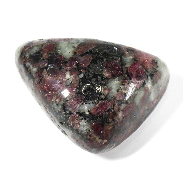 ロシア産のユーディアライト、タンブルです。産出量の少ない希少な石。深いワインレッドとキラキラとした結晶がとてもきれいで、神秘的な輝きを放ちます。赤い色が鮮やかであるほど貴重で、産地であるロシア・ラップランドではラップランドのルビーという愛称があります。ユーディアライトではない母岩部分(おそらくソーダライト)が365nmの波長で蛍光しました。