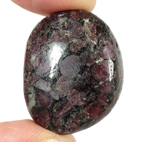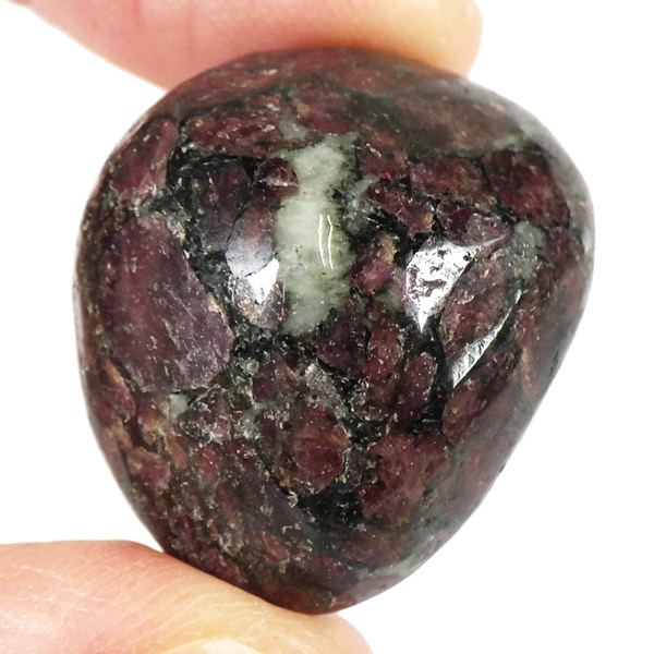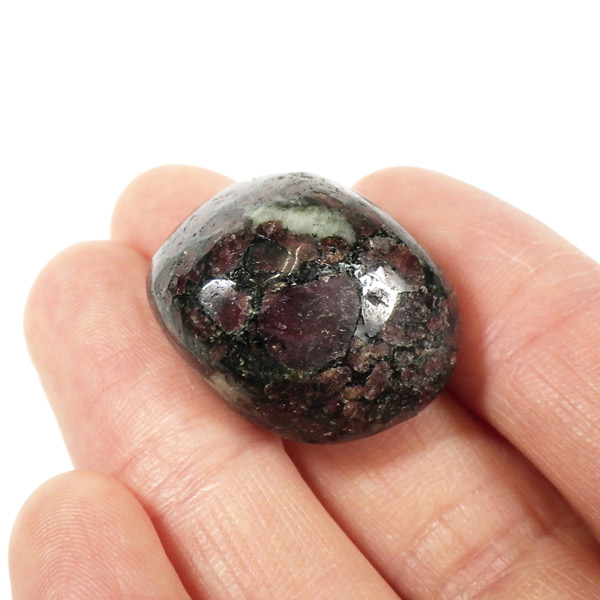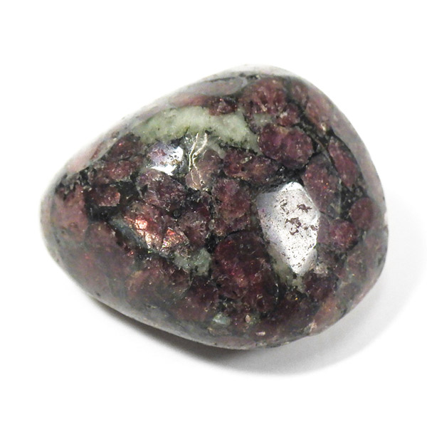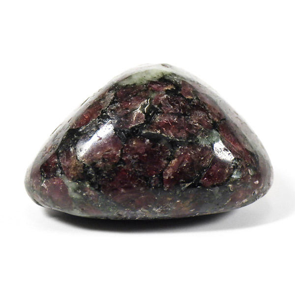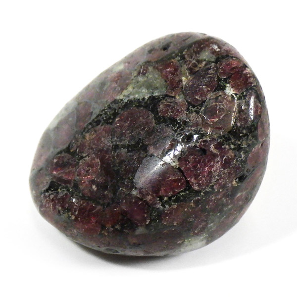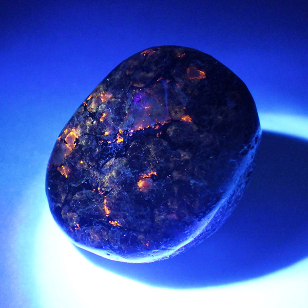 ロシア産のユーディアライト、タンブルです。産出量の少ない希少な石。深いワインレッドとキラキラとした結晶がとてもきれいで、神秘的な輝きを放ちます。赤い色が鮮やかであるほど貴重で、産地であるロシア・ラップランドではラップランドのルビーという愛称があります。ユーディアライトではない母岩部分(おそらくソーダライト)が365nmの波長で蛍光しました。