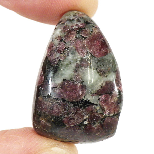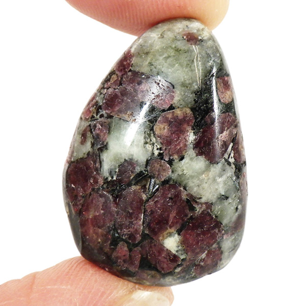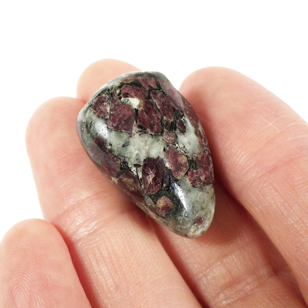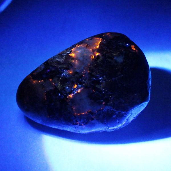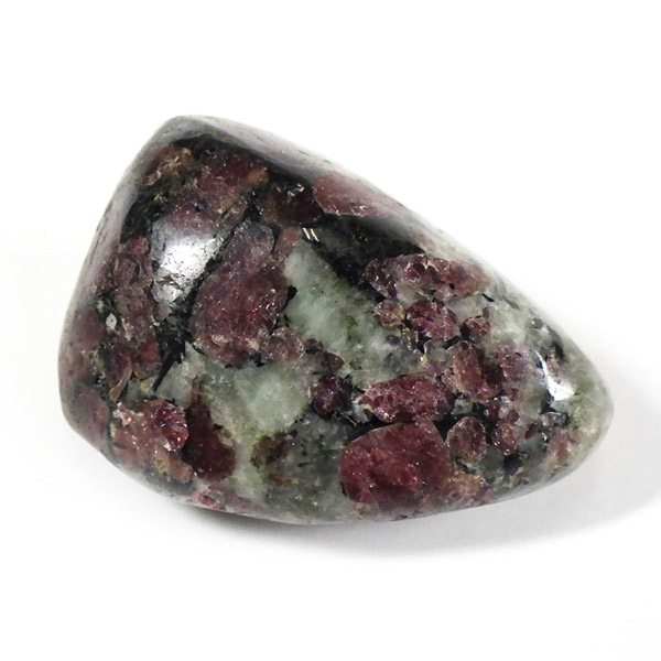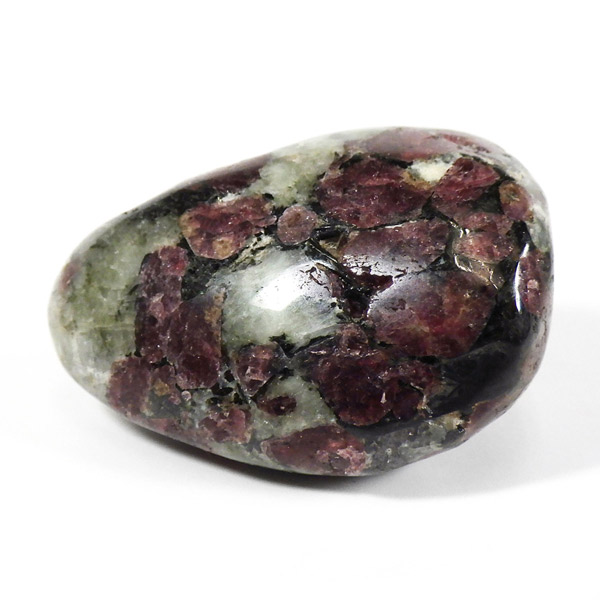 ロシア産のユーディアライト、タンブルです。産出量の少ない希少な石。深いワインレッドとキラキラとした結晶がとてもきれいで、神秘的な輝きを放ちます。赤い色が鮮やかであるほど貴重で、産地であるロシア・ラップランドではラップランドのルビーという愛称があります。ユーディアライトではない母岩部分(おそらくソーダライト)が365nmの波長で蛍光しました。