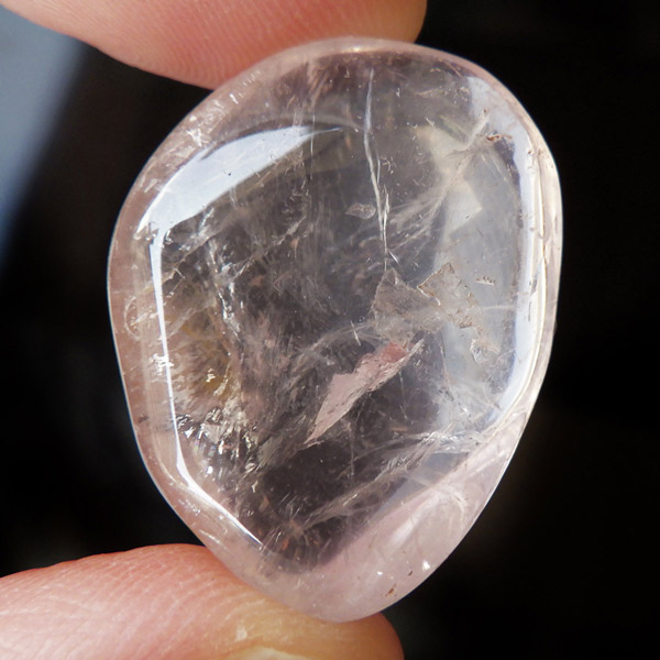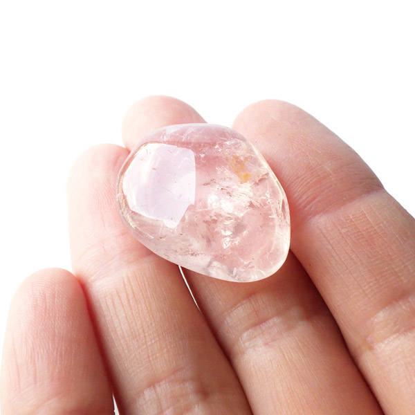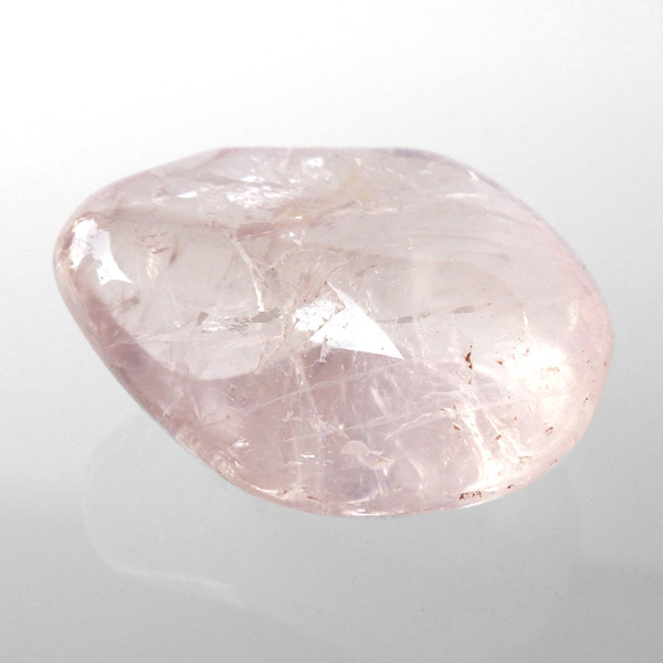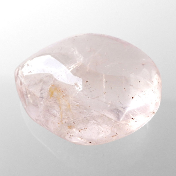 マダガスカル産のピンクジラソルクォーツ、タンブルです。ジラソルクォーツとはミルキークォーツの仲間で、マダガスカル特有の乳白色の光沢感のある水晶のことです。クォーツでありながらムーンストーンのような透明感があることが特徴で、カットの仕方によっては、独特のスター効果が現れます。アルミニウムやチタンの含有によって、薄っすらとピンク色になるものもあり、それをピンクジラソルクォーツと呼びます。ピンクジラソルは、スターローズクォーツと近縁で、酸化の具合でホワイトのミルキークォーツとの中間に位置する鉱物です。