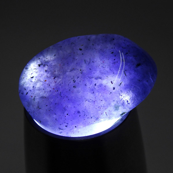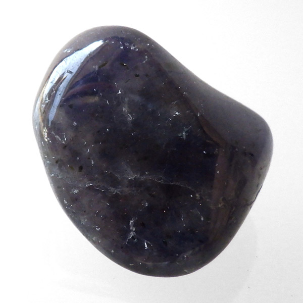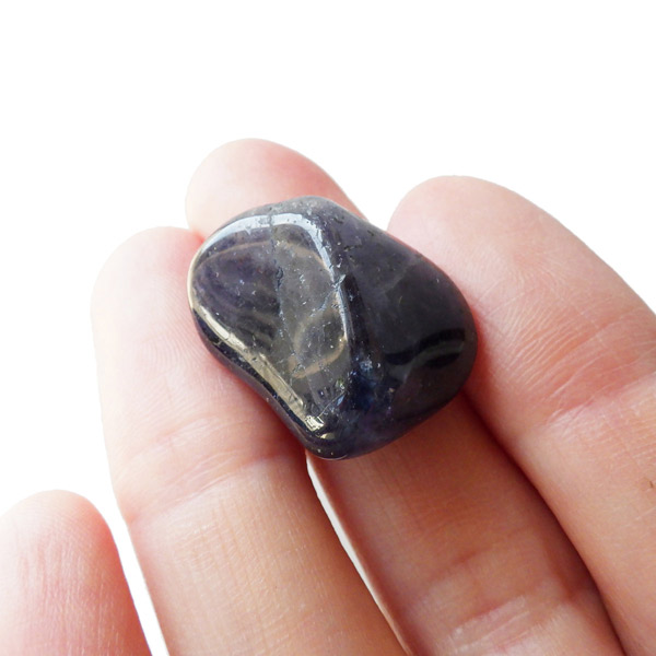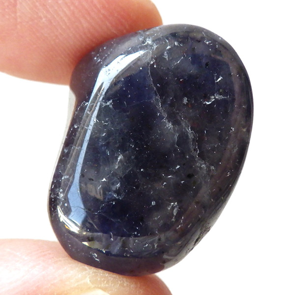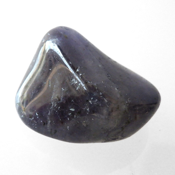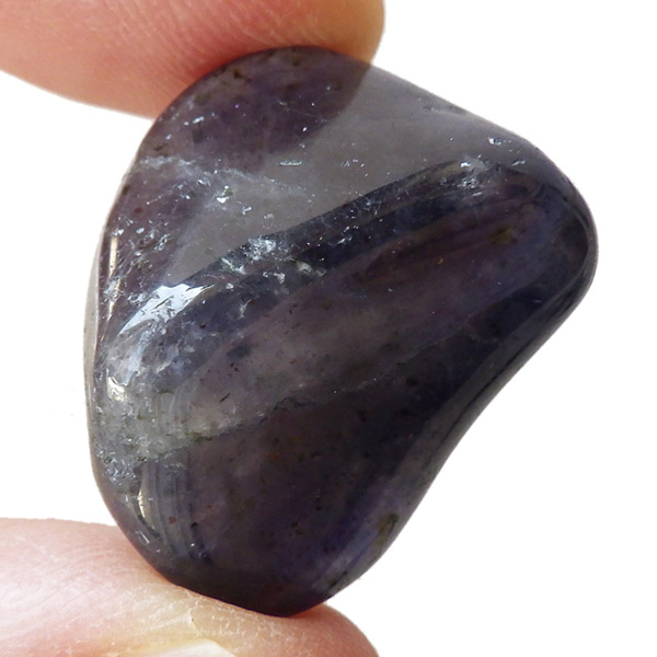 インド産のアイオライト、タンブルです。アイオライトは見る角度によって色が変化するという神秘的な鉱石です。広域変成岩や接触変成岩などで発見されるケイ酸塩鉱物の一種で、多色性が強く、見る角度によって群青色から淡い枯れ草色に変化します。透明度こそ高くはありませんが、光に透かすとブラッドショットと呼ばれる赤い斑点が見られるブラッドショットアイオライトとも呼ばれています。