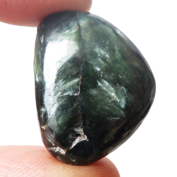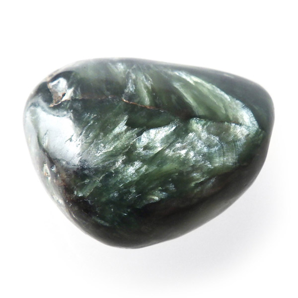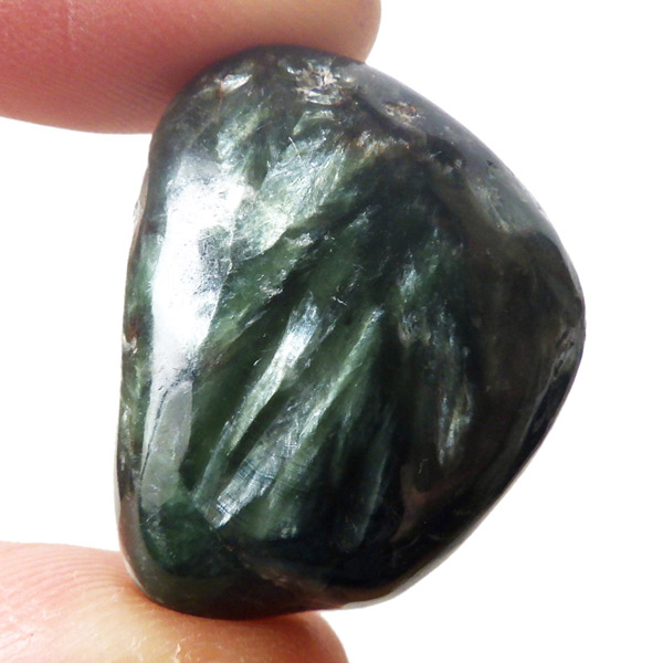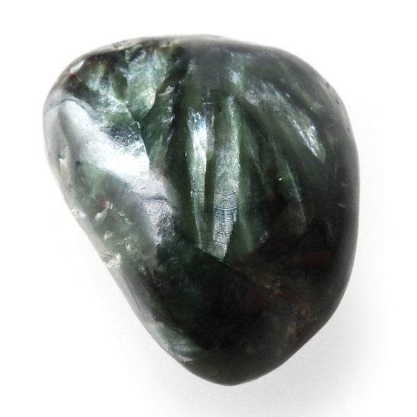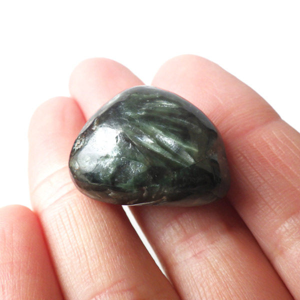 ロシア産セラフィナイト、タンブルです。美しいグリーンを持つセラフィナイト、色の濃淡が大変美しく、濃いグリーンの部分から白い羽根が舞い落ちるような模様になっています。角度によって輝きが変化するシルバーの雲母もこのセラフィナイトの美しさを引き立てています。