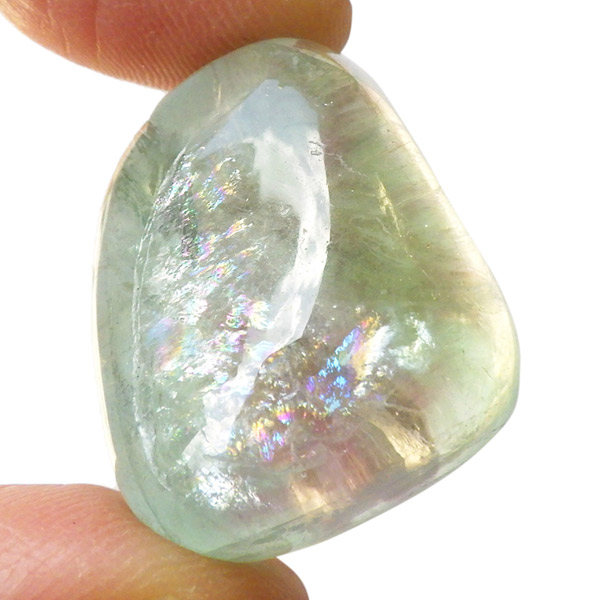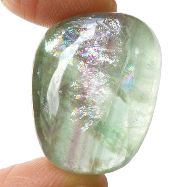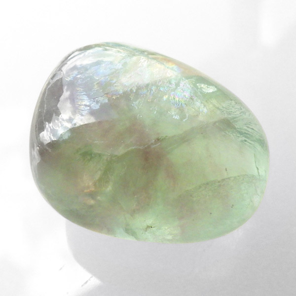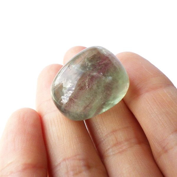 マルチカラーフローライト、タンブルです。 大変透明度が高く、いろいろなカラーの色彩が見られます。蛍石の名前の通り、様々な角度からその美しさを楽しむことができます。光にかざして透かすと、カラーが複雑に入り乱れており、そのグラデーションが大変きれいです。