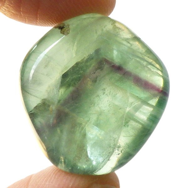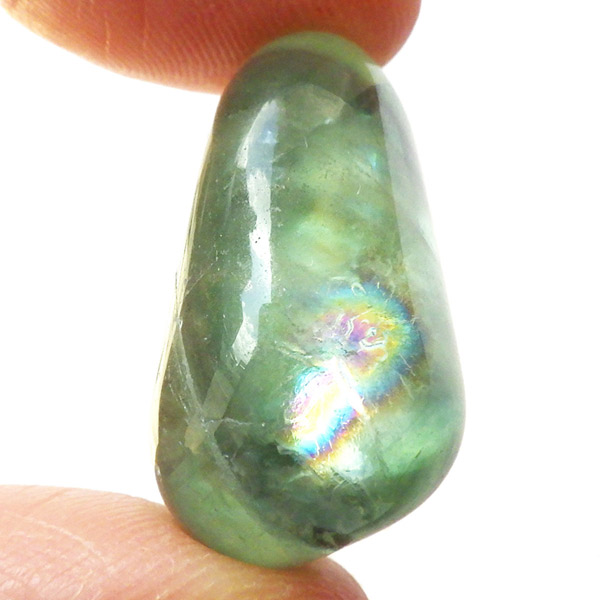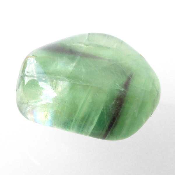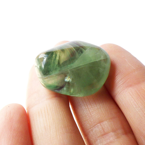 マルチカラーフローライト、タンブルです。 大変透明度が高く、いろいろなカラーの色彩が見られます。蛍石の名前の通り、様々な角度からその美しさを楽しむことができます。光にかざして透かすと、カラーが複雑に入り乱れており、そのグラデーションが大変きれいです。