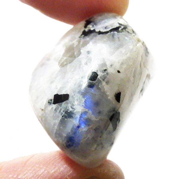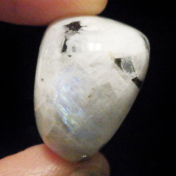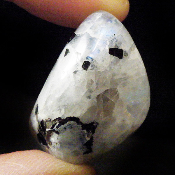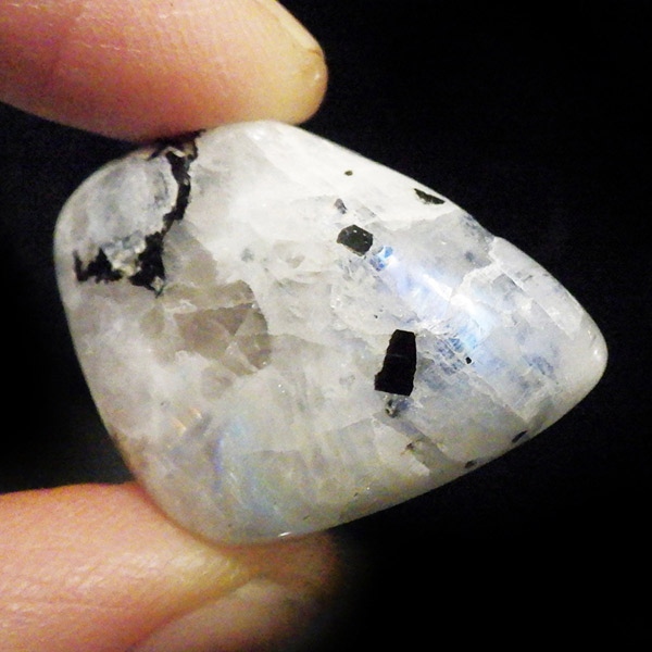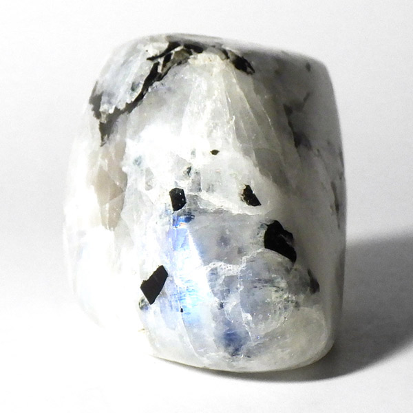 インド産のムーンストーンです。ムーンストーンは長石(フェルドスパー)という鉱物グループの一種で、和名を月長石といいます。石の内部にある層が光を乱反射して出現する真珠のような柔らかい光の効果を「シラー効果」と呼び、ムーンストーンに見られる特徴です。その光の色は青白いものから、ピンク、オレンジ、白、グレーなど様々です。黒く見える部分は錐輝石のエジリンです。