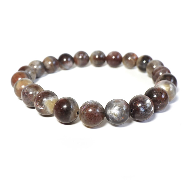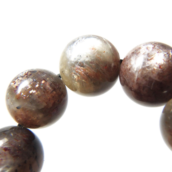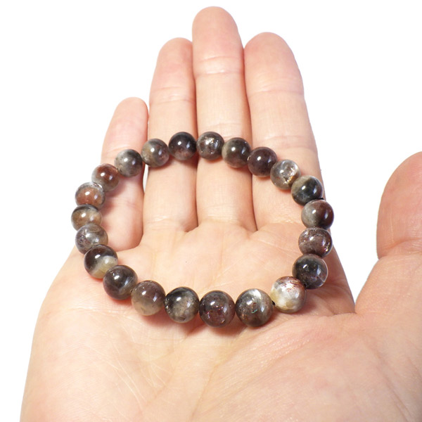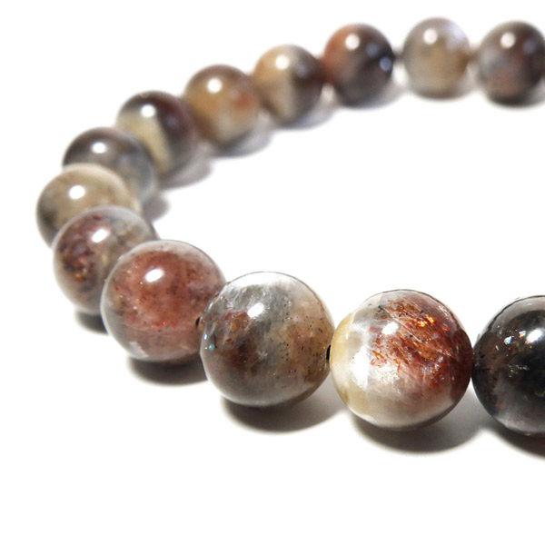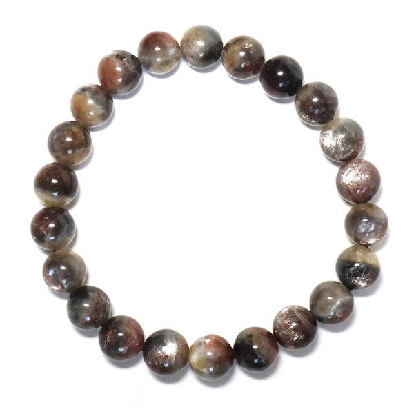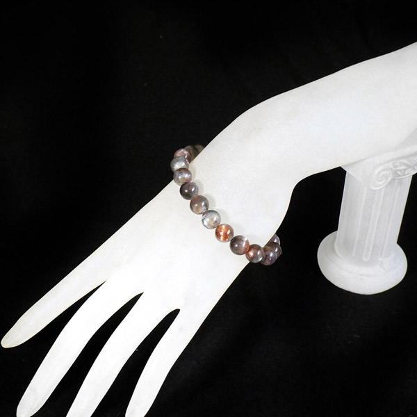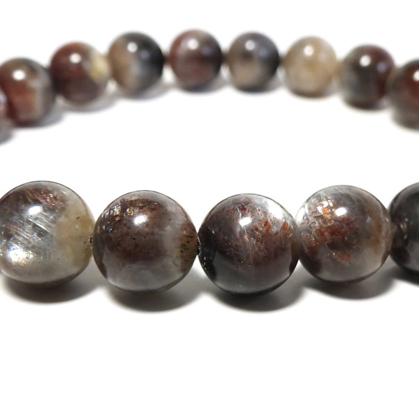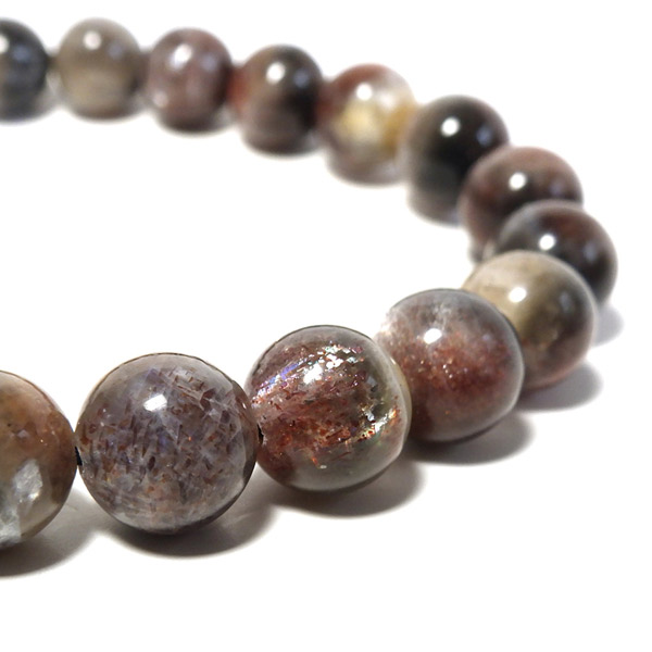 プラチナサンストーンを使用したブレスレットです。プラチナサンストーンという非常に珍しく、興味深いブレスレットが入荷しました。アイオライト、サンストーン、ムーンストーンが混ざったような見た目をしております。ムーンストーンのように青白く、プラチナのような輝きのシラー、ブラッドショットアイオライトのようなラメのような煌めき、サンストーンのような強い輝きを秘めております。ブルー、レッド、プラチナの配色もかっこ良いです。光学効果が非常に見られ、見れば見るほどおもしろいブレスレットになっております。確かな目で厳選しており、品質も大変良いものでおすすめです。