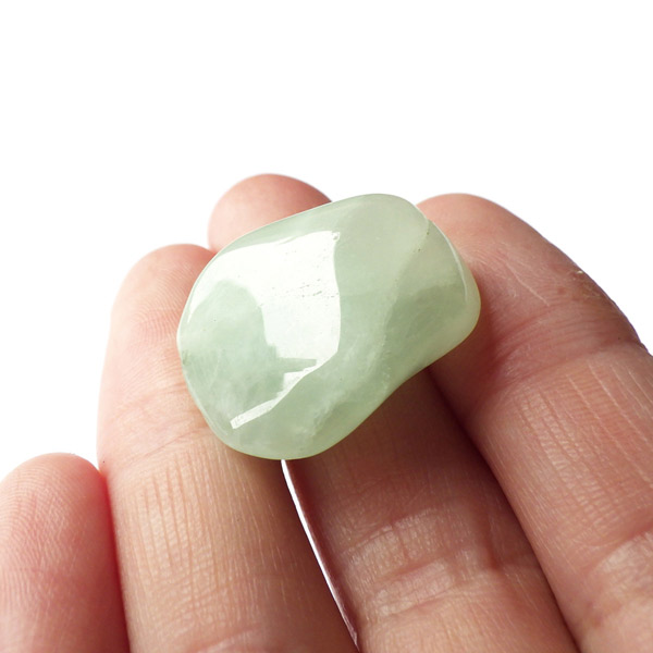 南アフリカ産のプレナイト、タンブルです。プレナイトは、淡い青緑から黄色にかけての色合いの石。1788年に南アフリカで初めてこの石を発見したフォン・プレーン大佐にちなんで名付けられました。葡萄石という和名は産出時に見た目が葡萄のようであったことから名づけられました。今回は黄色味がかったものではなく、発色の良いミルキーな青よりの緑のプレナイトをご用意いたしました。優しい色合いで心が落ち着きます。