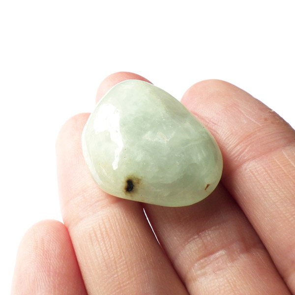 南アフリカ産のプレナイト、タンブルです。プレナイトは、淡い青緑から黄色にかけての色合いの石。1788年に南アフリカで初めてこの石を発見したフォン・プレーン大佐にちなんで名付けられました。葡萄石という和名は産出時に見た目が葡萄のようであったことから名づけられました。今回は黄色味がかったものではなく、発色の良いミルキーな青よりの緑のプレナイトをご用意いたしました。優しい色合いで心が落ち着きます。