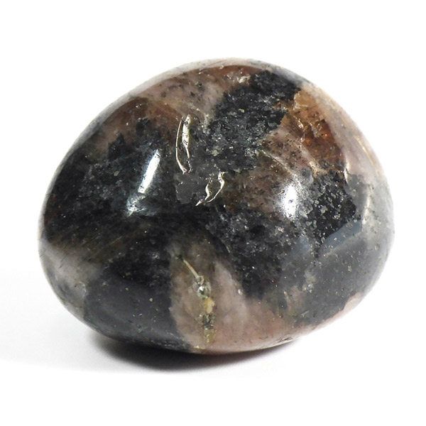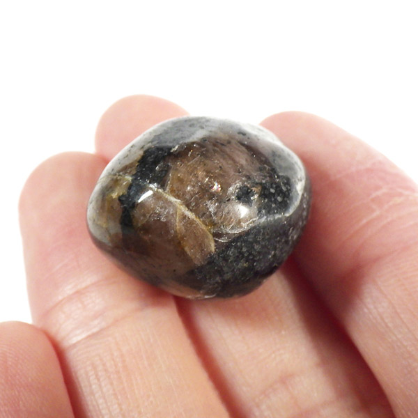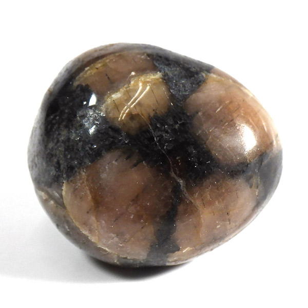 スペイン産、キャストライトタンブルです。濃いブラウンに黒の十字模様が大変魅力的な石です。 キャストライトの名前は、輪切りにすると黒い十字の模様が現れることから、ギリシャ語で「対角線的な配列」という意味の「Chiastos」に由来しています。 キャストライトは、黒鉛(グラファイト)などの黒色含有物を対称的に含んだ紅柱石です。クロスストーンとも呼ばれ、粘板岩と花こう岩の接触部に産出します。黒の十字が目を引く一方、茶色のサイド面の結晶がキラキラと美しく見えるのも魅力的です。