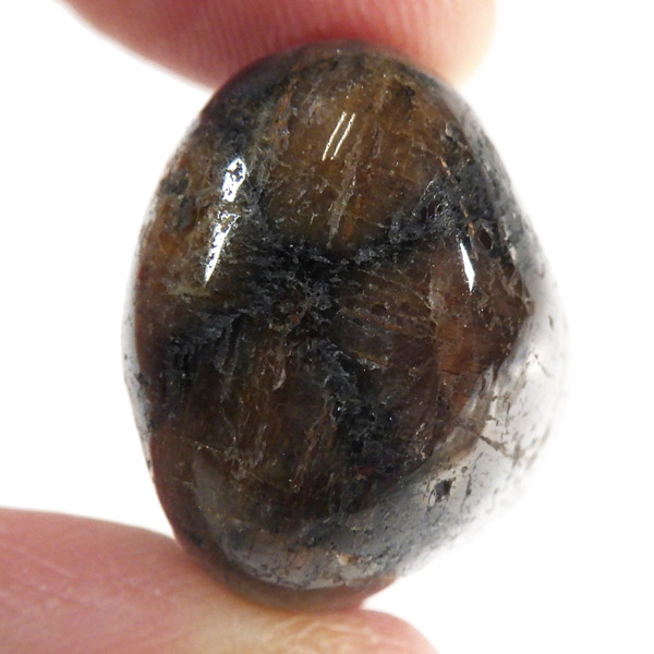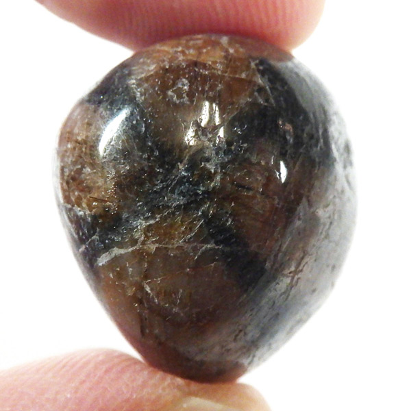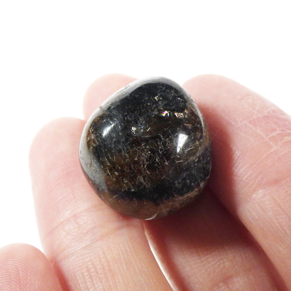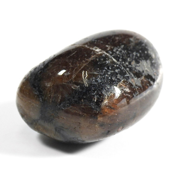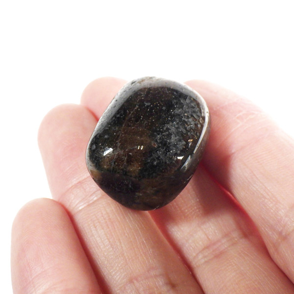 スペイン産、キャストライトタンブルです。濃いブラウンに黒の十字模様が大変魅力的な石です。 キャストライトの名前は、輪切りにすると黒い十字の模様が現れることから、ギリシャ語で「対角線的な配列」という意味の「Chiastos」に由来しています。 キャストライトは、黒鉛(グラファイト)などの黒色含有物を対称的に含んだ紅柱石です。クロスストーンとも呼ばれ、粘板岩と花こう岩の接触部に産出します。黒の十字が目を引く一方、茶色のサイド面の結晶がキラキラと美しく見えるのも魅力的です。