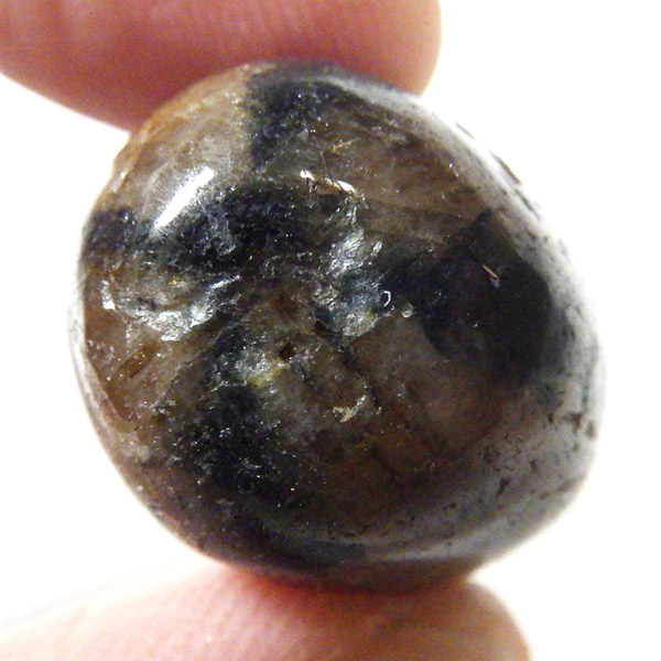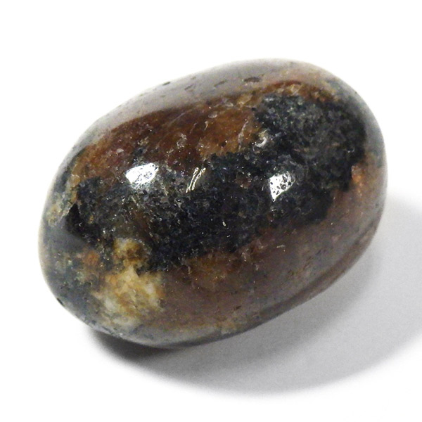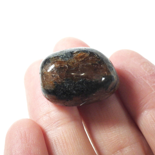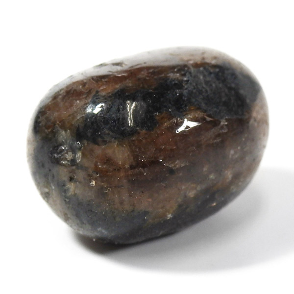スペイン産、キャストライトタンブルです。濃いブラウンに黒の十字模様が大変魅力的な石です。 キャストライトの名前は、輪切りにすると黒い十字の模様が現れることから、ギリシャ語で「対角線的な配列」という意味の「Chiastos」に由来しています。 キャストライトは、黒鉛(グラファイト)などの黒色含有物を対称的に含んだ紅柱石です。クロスストーンとも呼ばれ、粘板岩と花こう岩の接触部に産出します。黒の十字が目を引く一方、茶色のサイド面の結晶がキラキラと美しく見えるのも魅力的です。