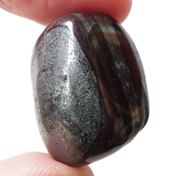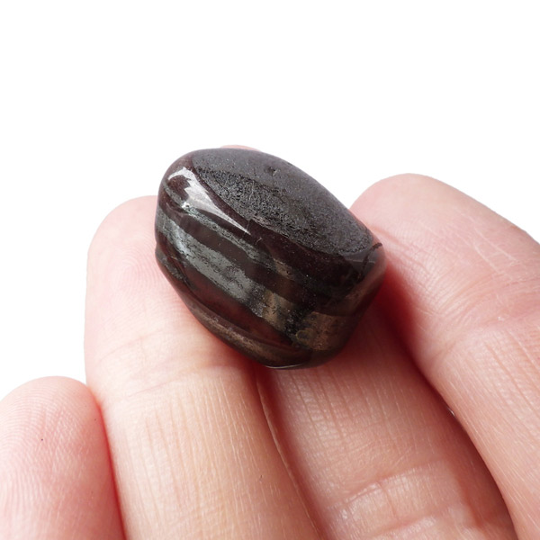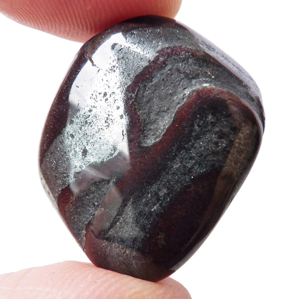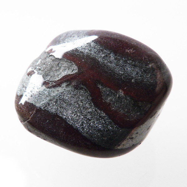 ブラジルの縞状鉄鉱層から産出するアンセストラライトのタンブルです。アンセストラライトはレッドジャスパーとヘマタイトからなる一部地域から採れる石のこと。レッドジャスパーの赤は元々ヘマタイト(赤鉄鉱)によるものです。粒状鉄鉱層からスペキュラーヘマタイトのようにキラキラとしたヘマタイトが産出します。27億年程前の地層の石ということでアンセストラライト(祖先石)という愛称でも呼ばれております。クリムゾンレッドとシルバーの縞模様が面白く、キラキラとしたヘマタイトも魅力的です。
